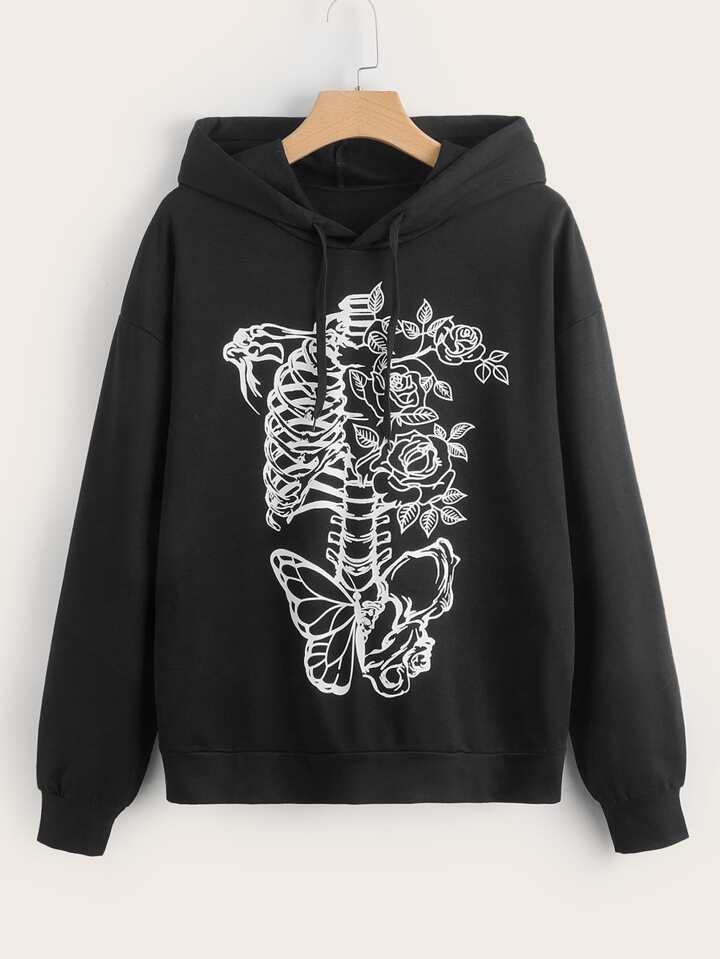 Skeleton & Butterfly Graphic Drawstring Hoodie