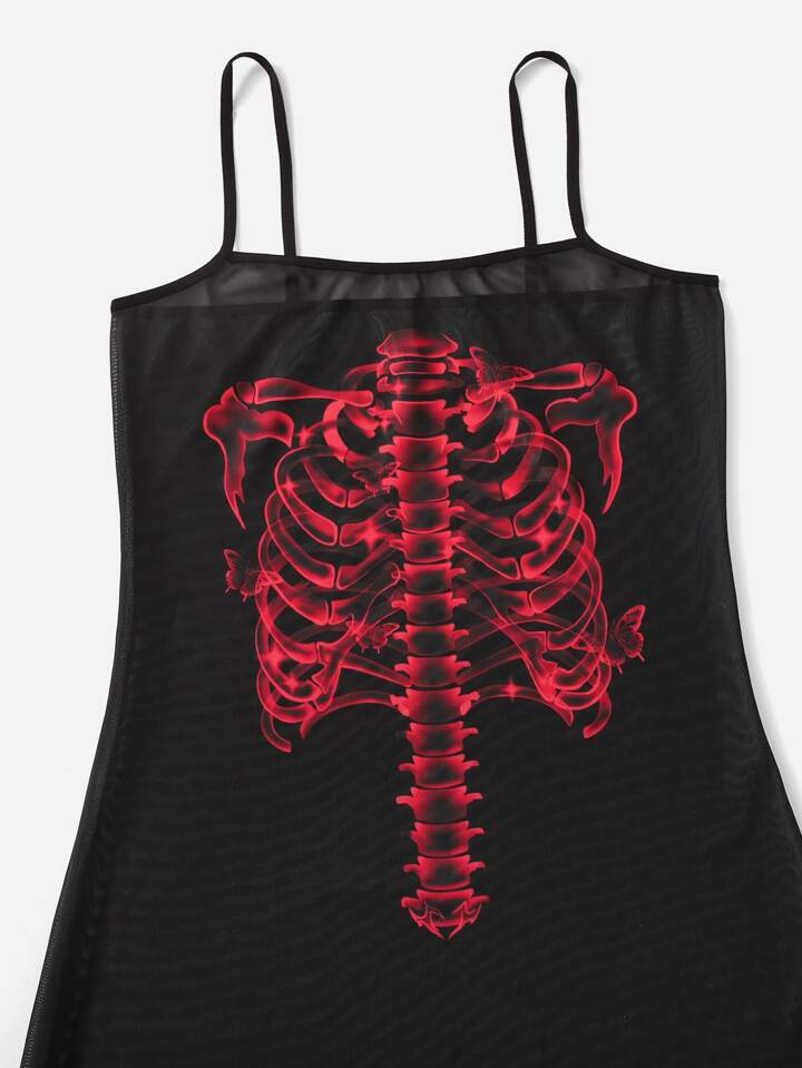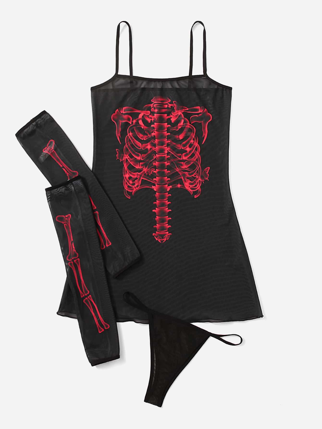 Skeleton Graphic Babydoll & Thong & 1pair Oversleeves