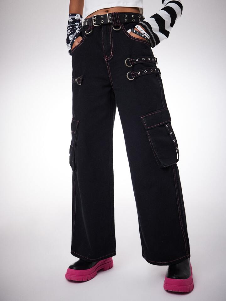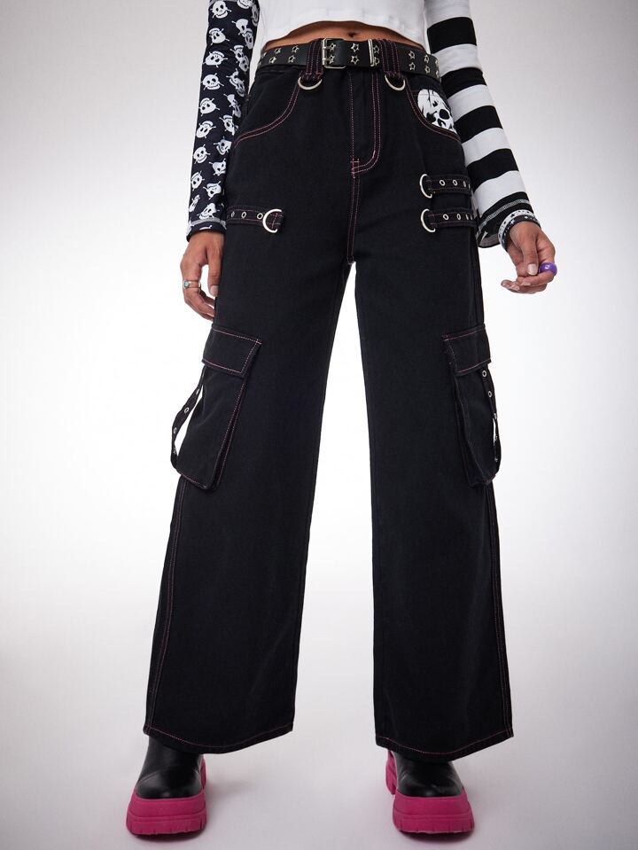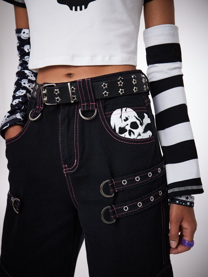 Skull Graphic Contrast Stitch Flap Pocket Cargo Jeans Without Belt