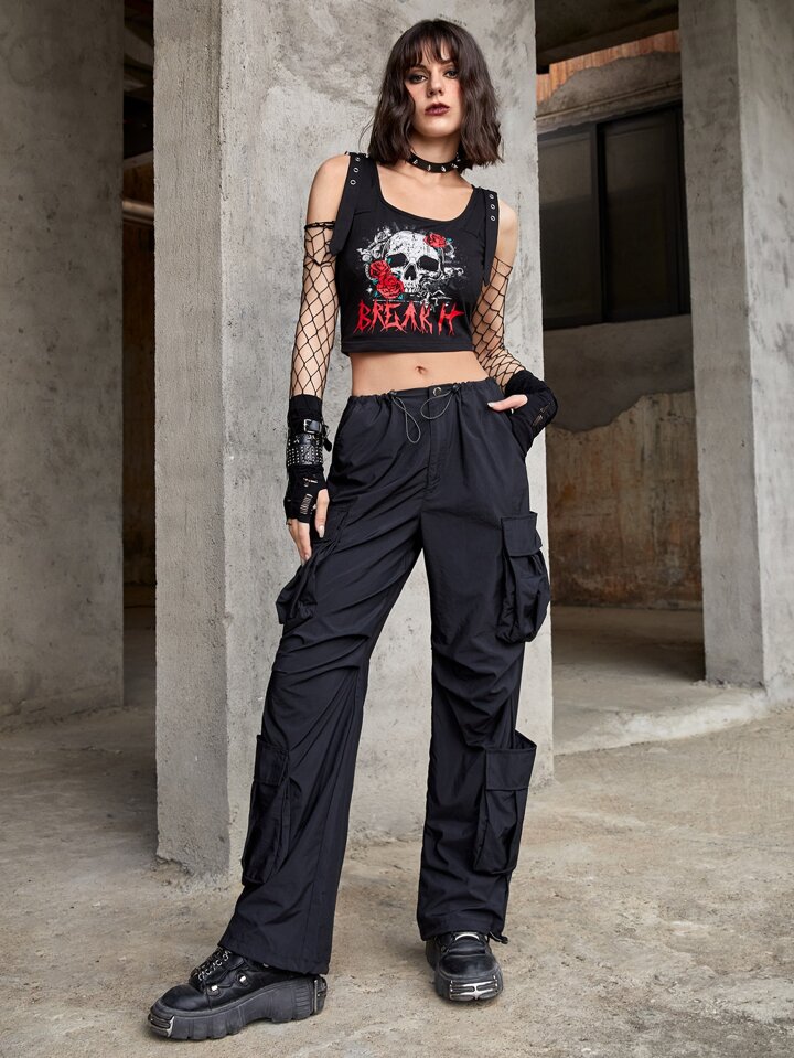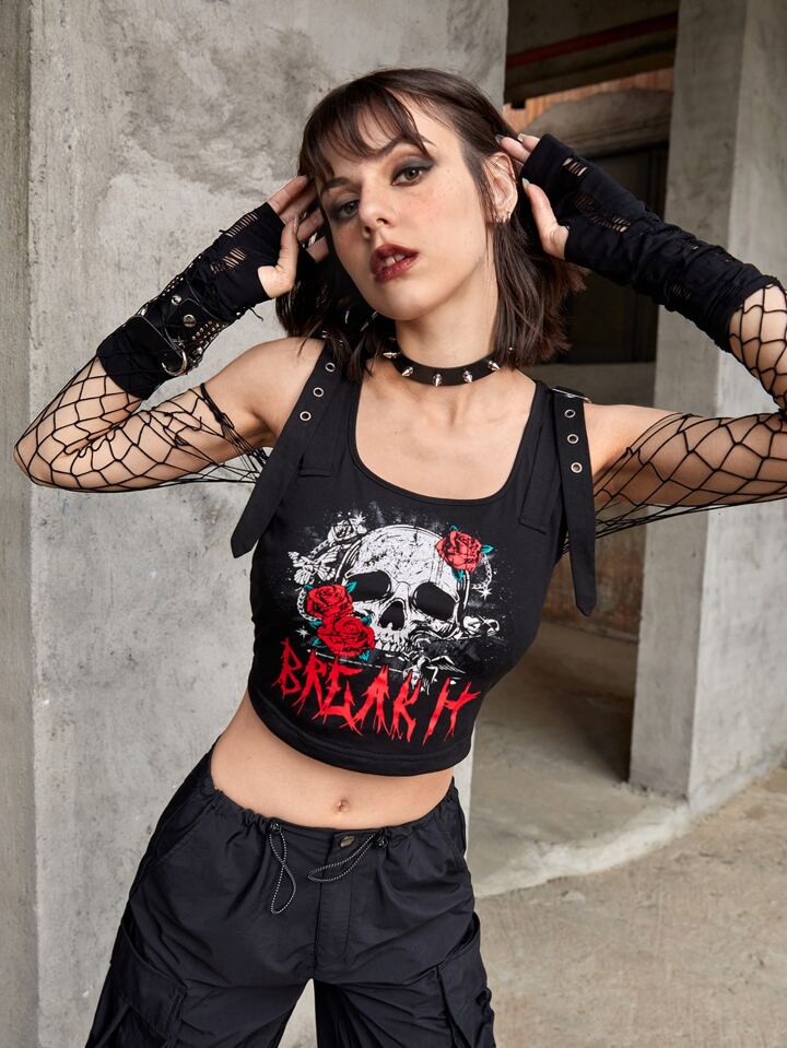 Skull & Rose Print Grommet Eyelet Buckle Detail Crop Tank Top
