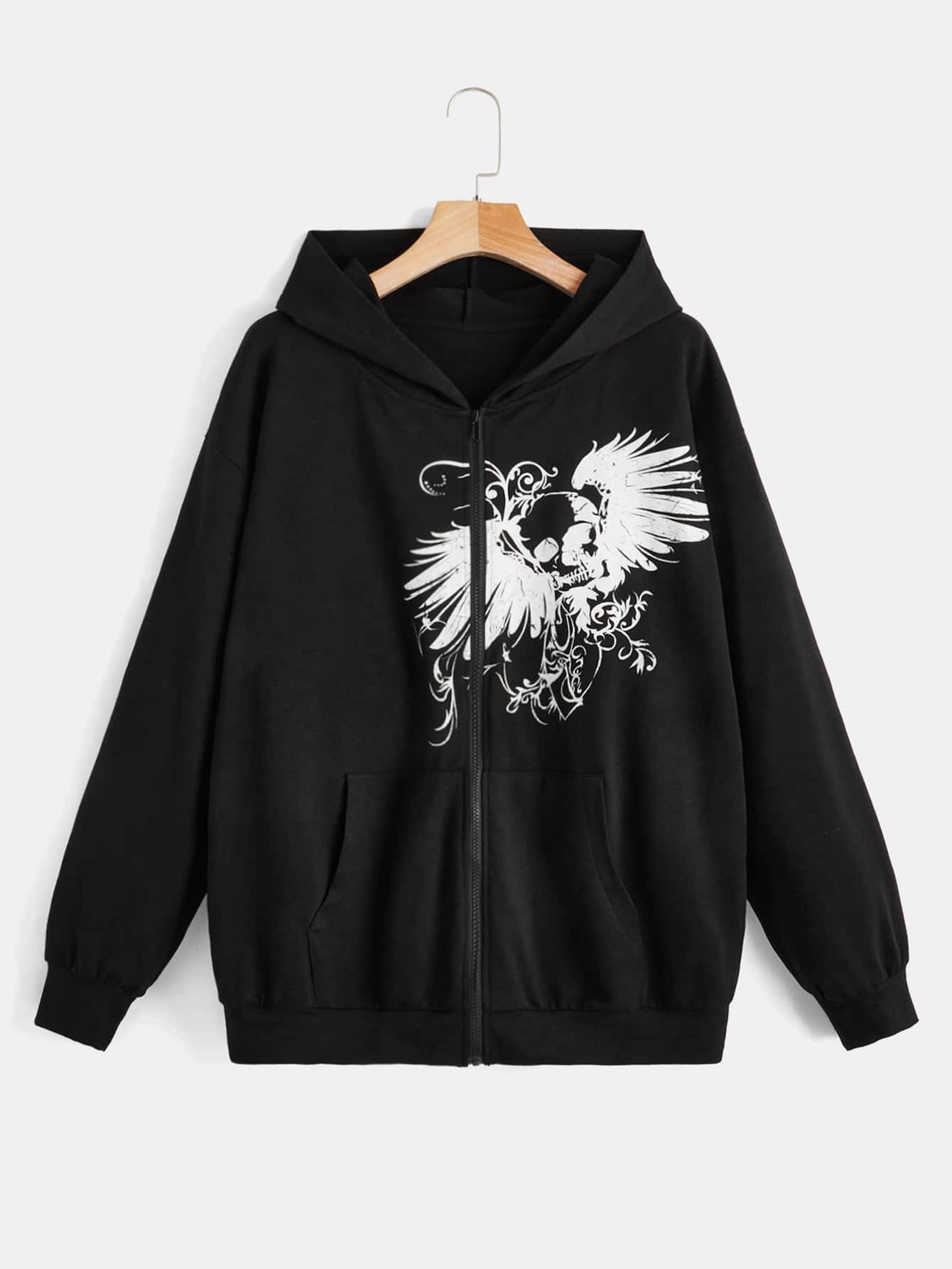 Skull Wings Graphic Zip Up Pocket Hoodie