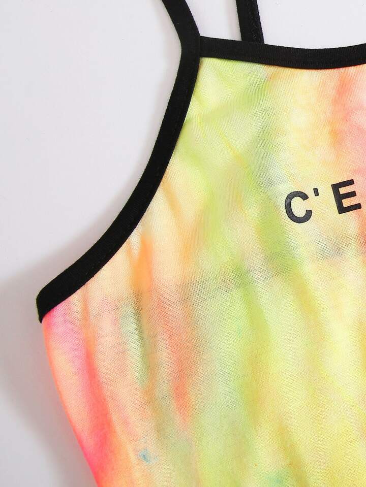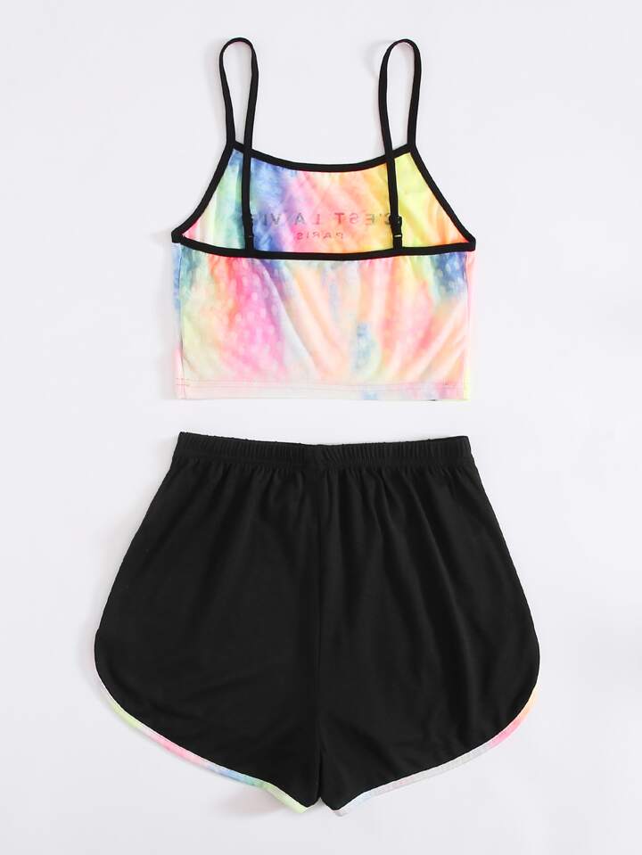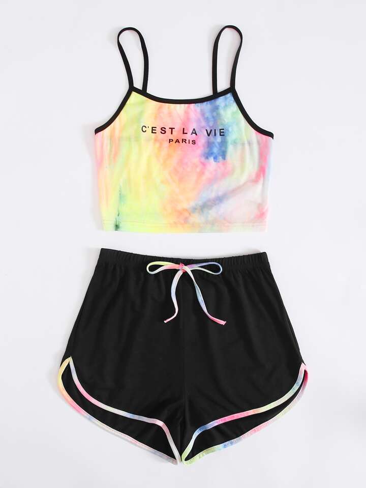 Slogan Graphic Tie Dye Cami Top and Dolphin Shorts Set