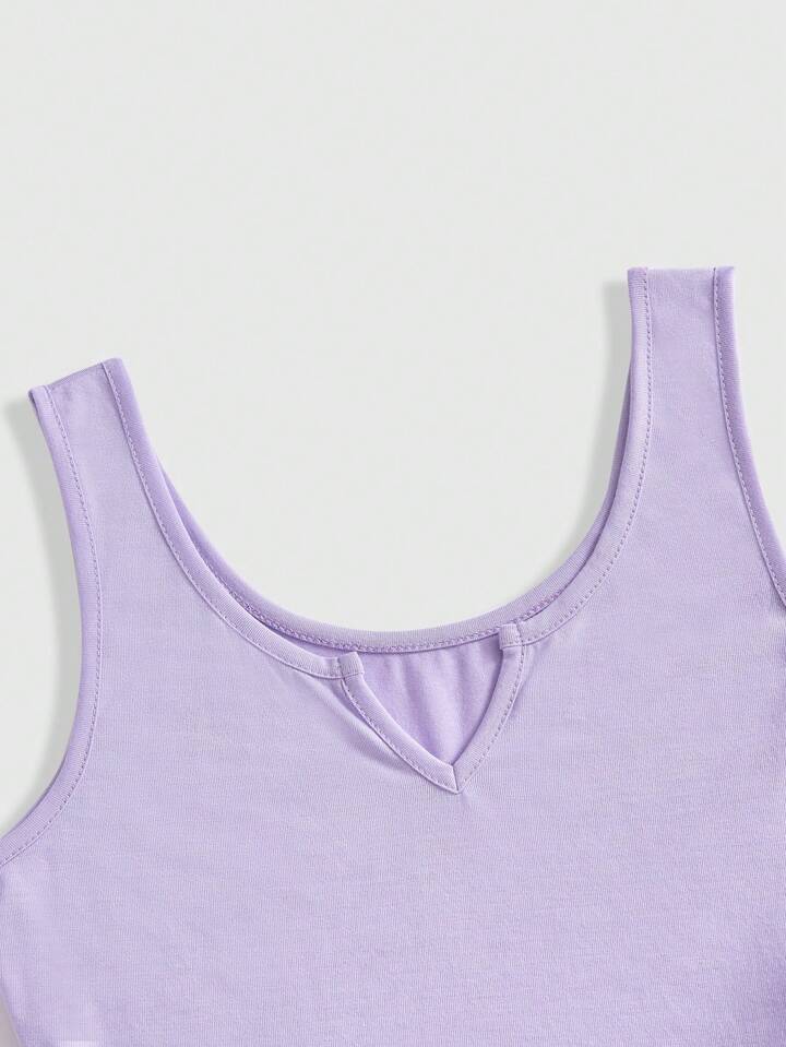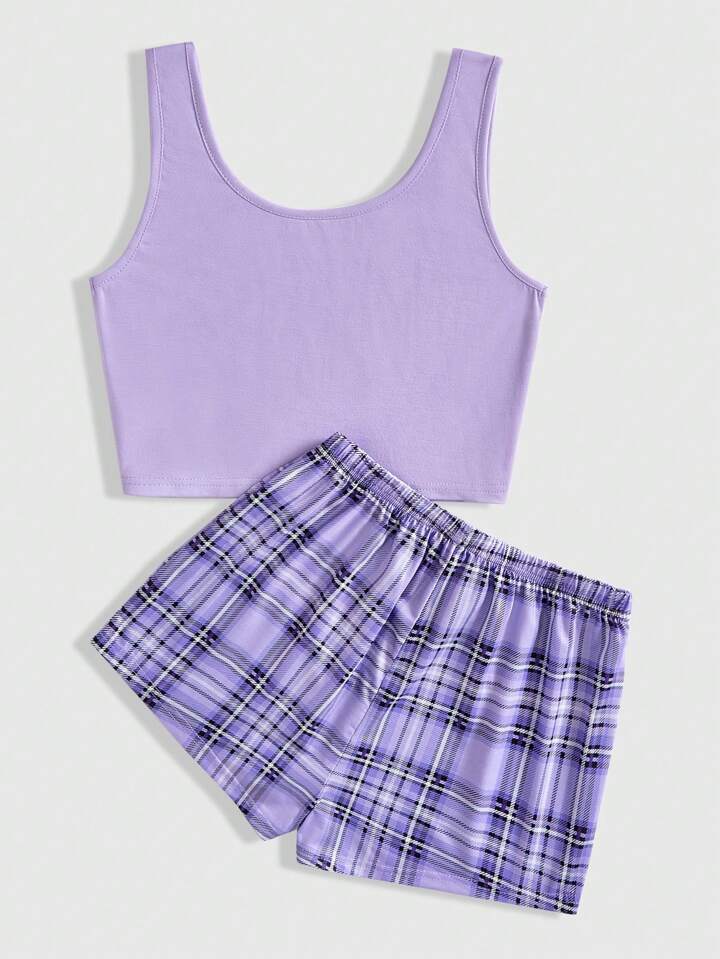 Solid Color Sleeveless Top & Plaid Shorts Casual Pajama Set, School