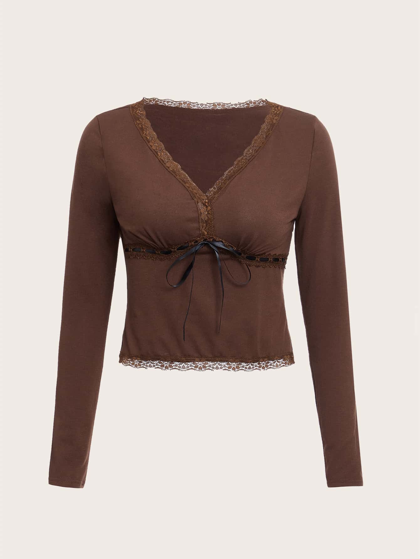 Solid Contrast Lace Tie Front Ribbed Crop Tee