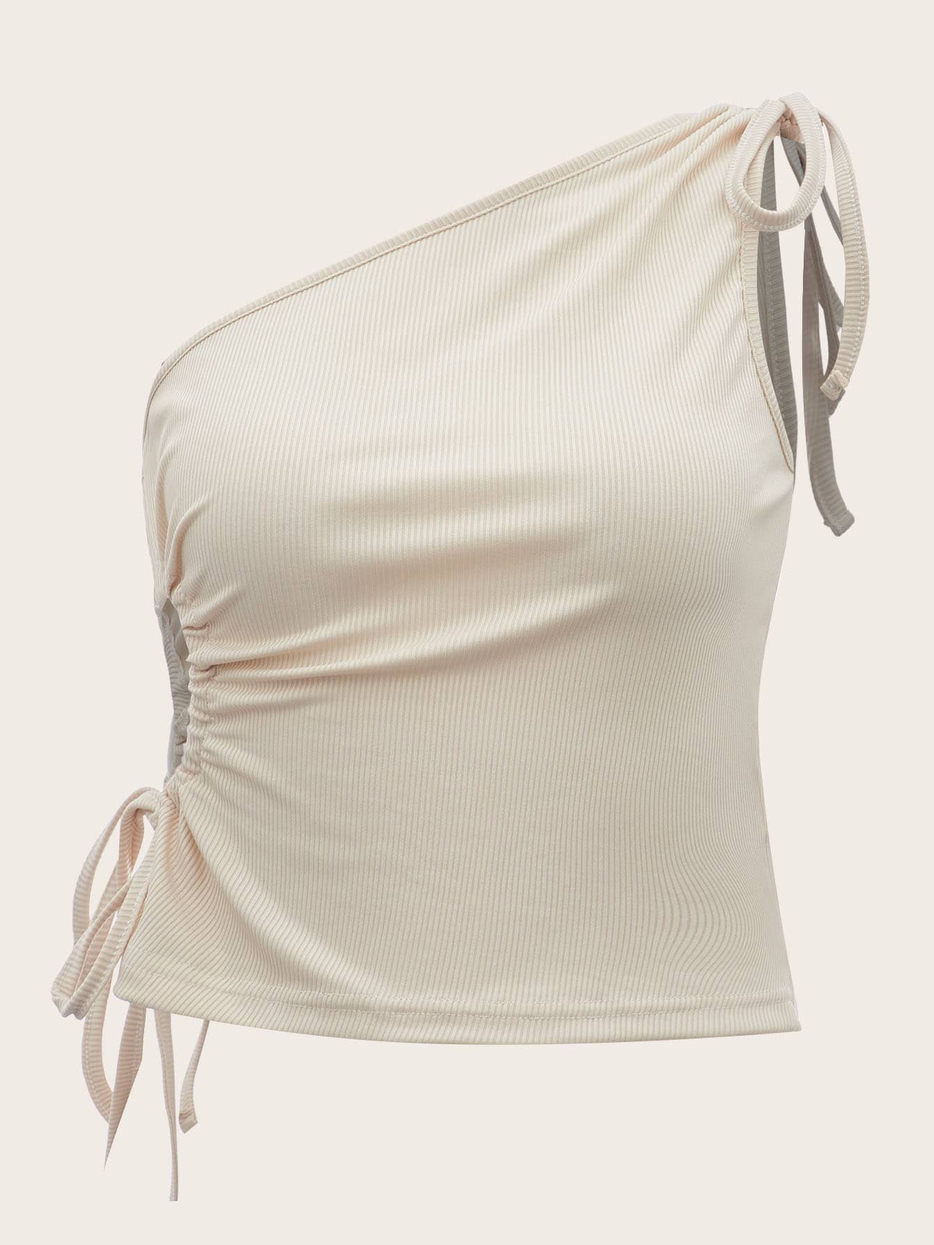 Solid Drawstring One Shoulder Ribbed Crop Top