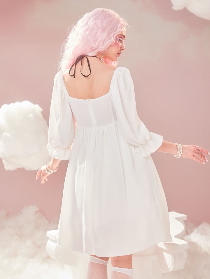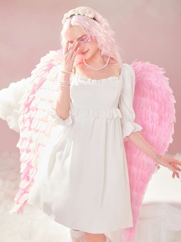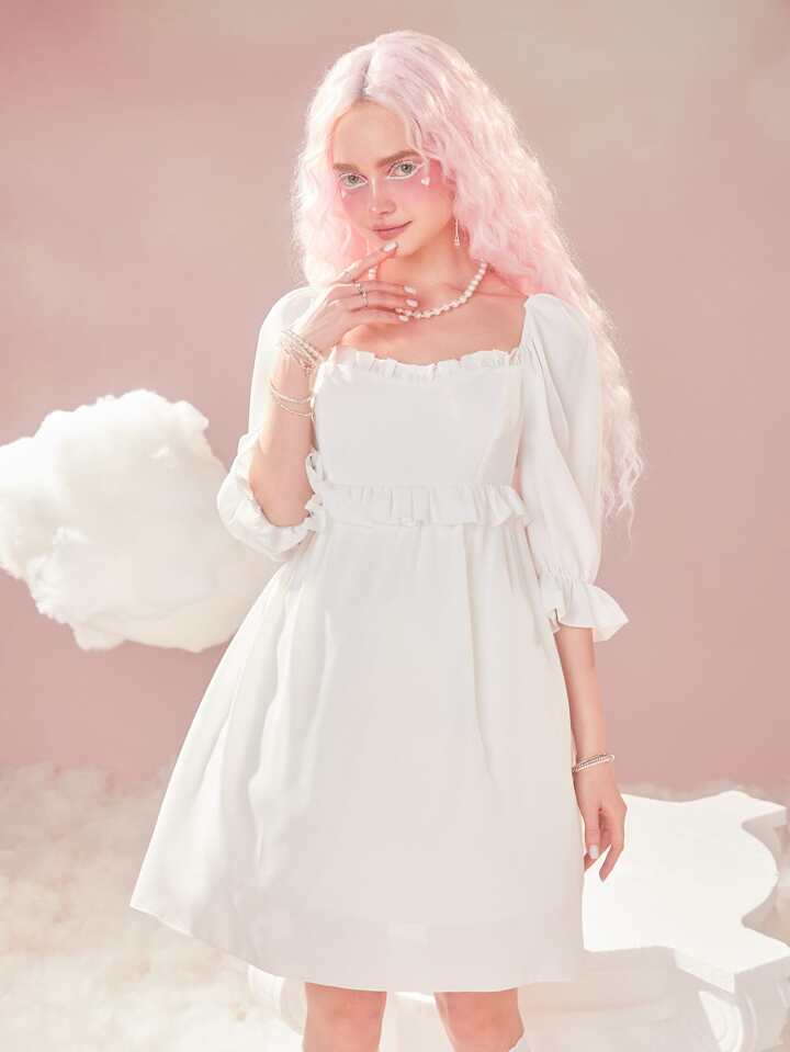 Solid Frill Trim Flounce Sleeve Dress