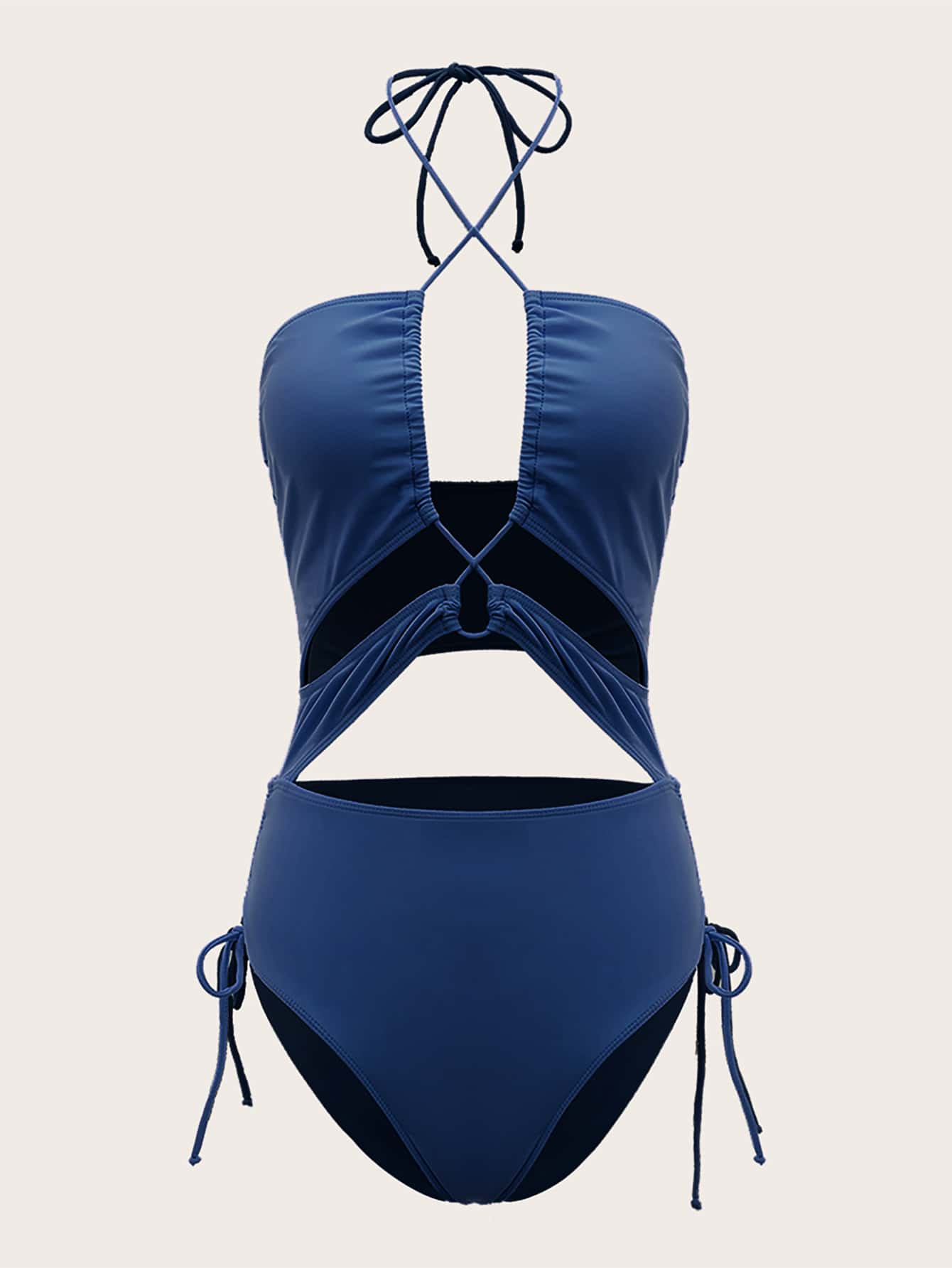Solid Knot Cut Out Halter One Piece Swimsuit