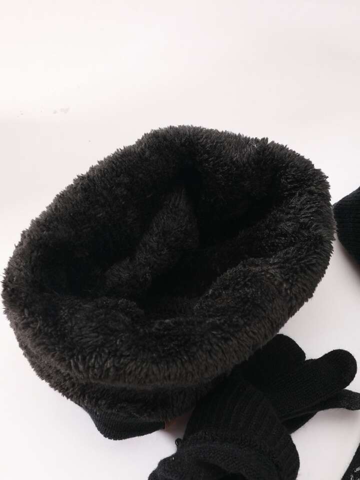 Solid Plush Lined Beanie & Gloves & Infinity Scarf