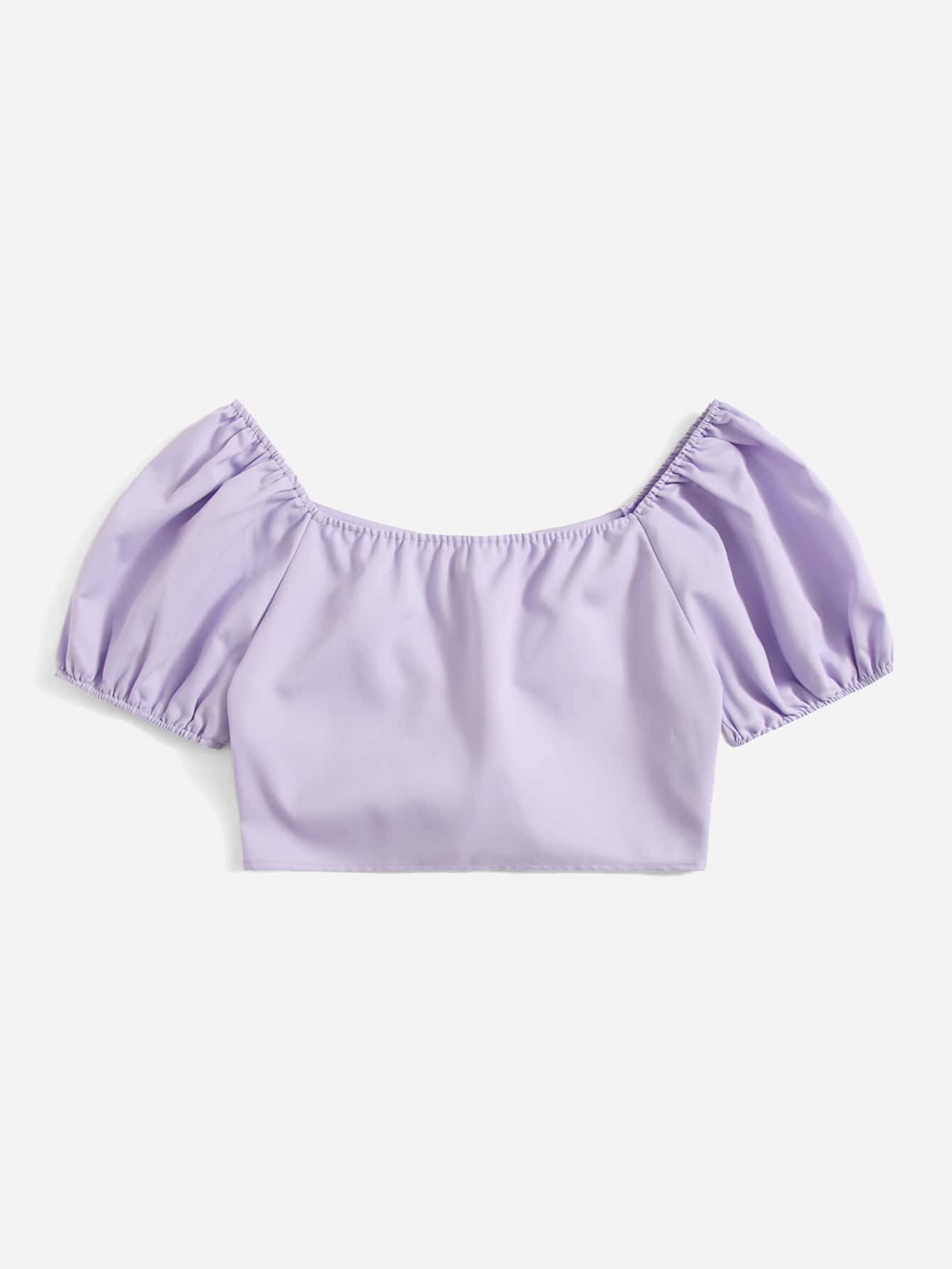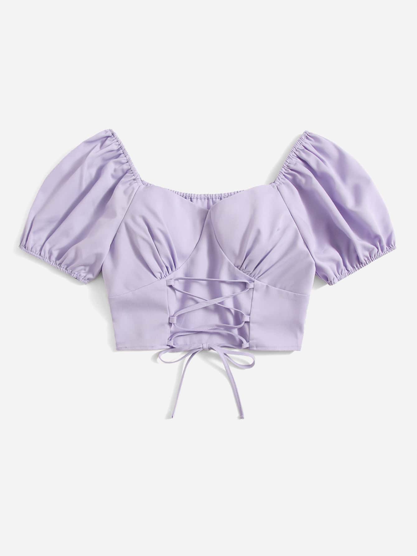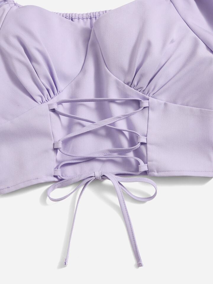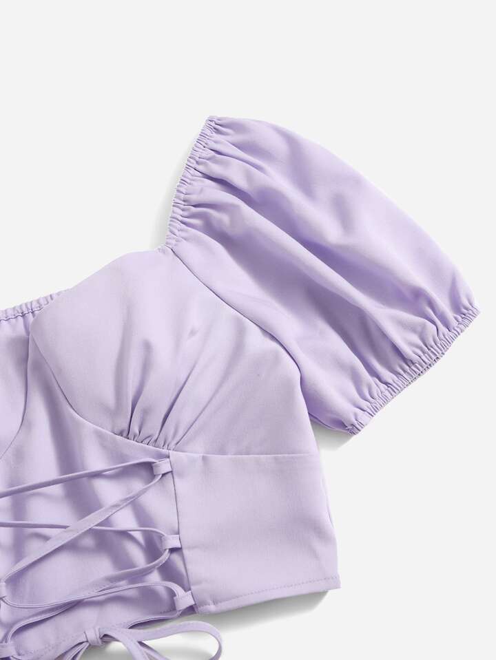 Solid Puff Sleeve Lace Up Blouse