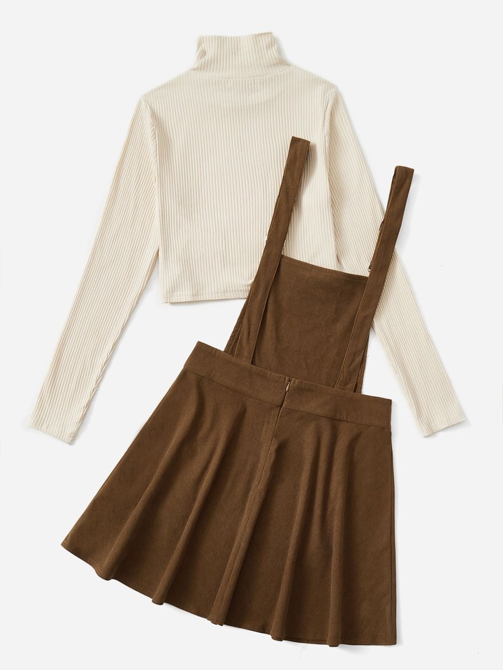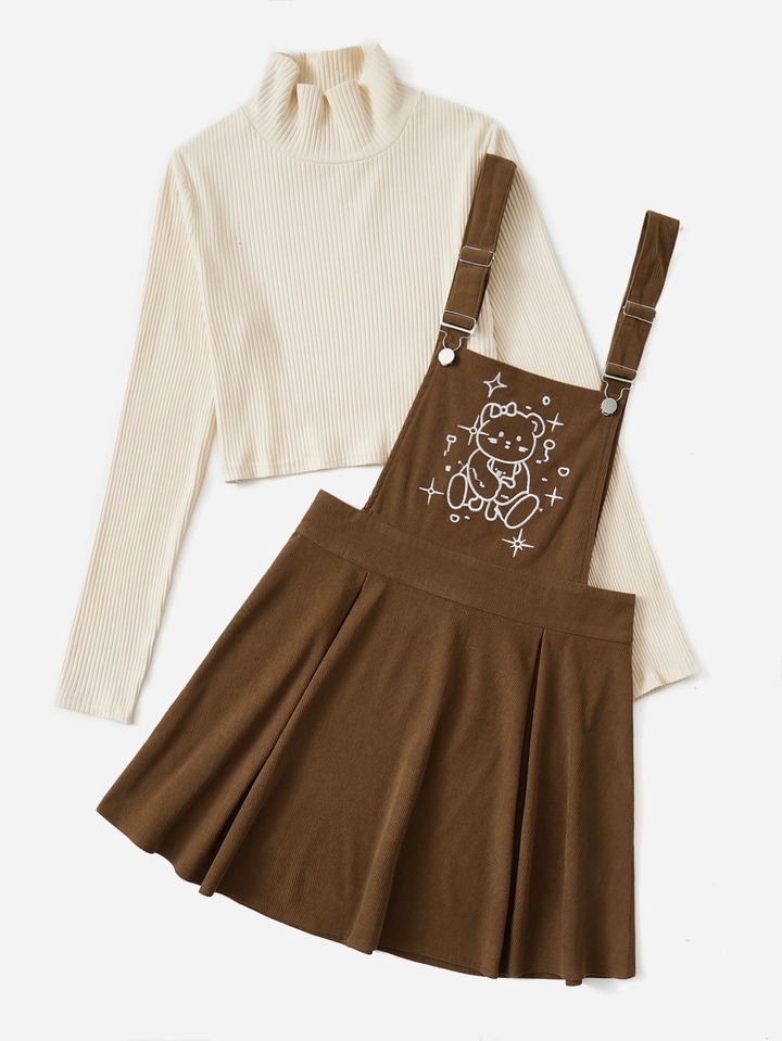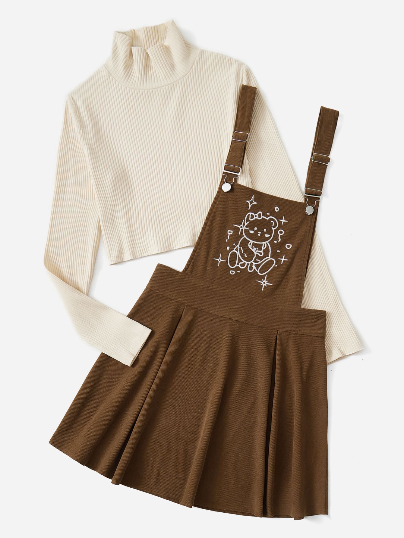 Solid Ribbed Tee & Cartoon Embroidery Pinafore Dress