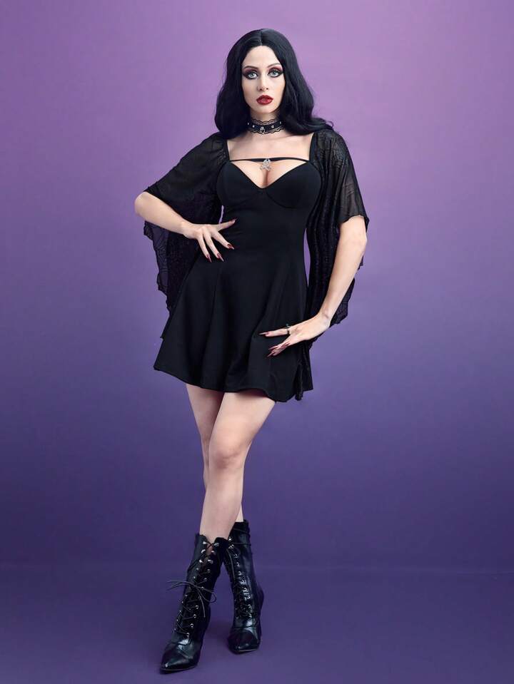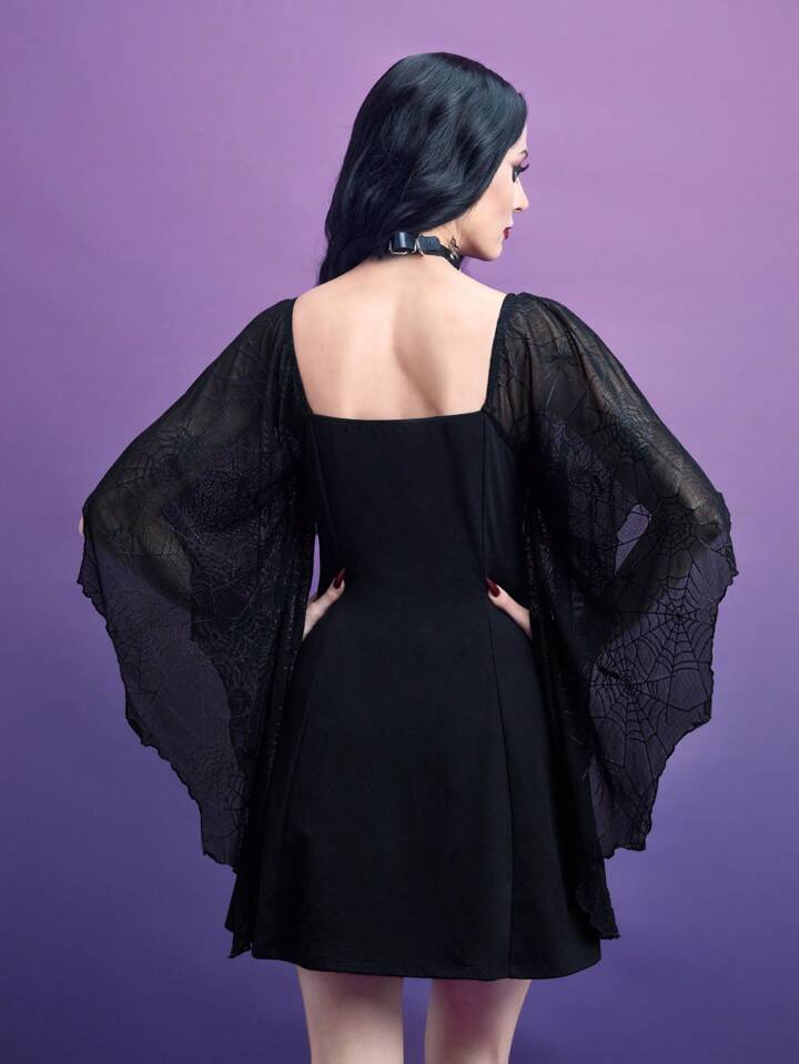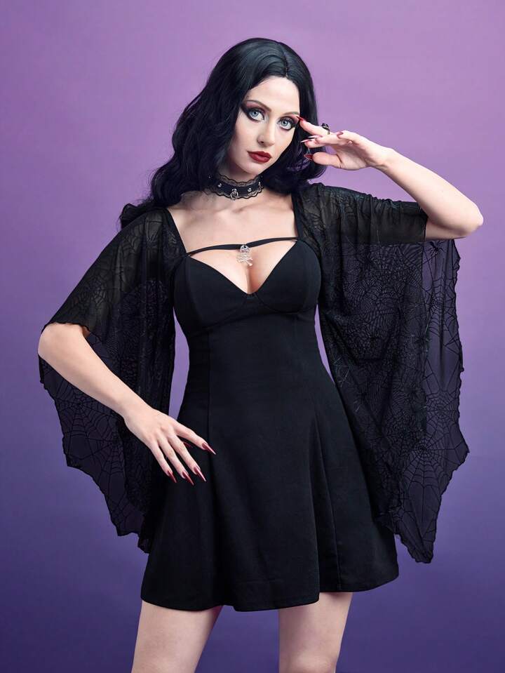 Spider Print Skull Decor Flounce Sleeve Dress