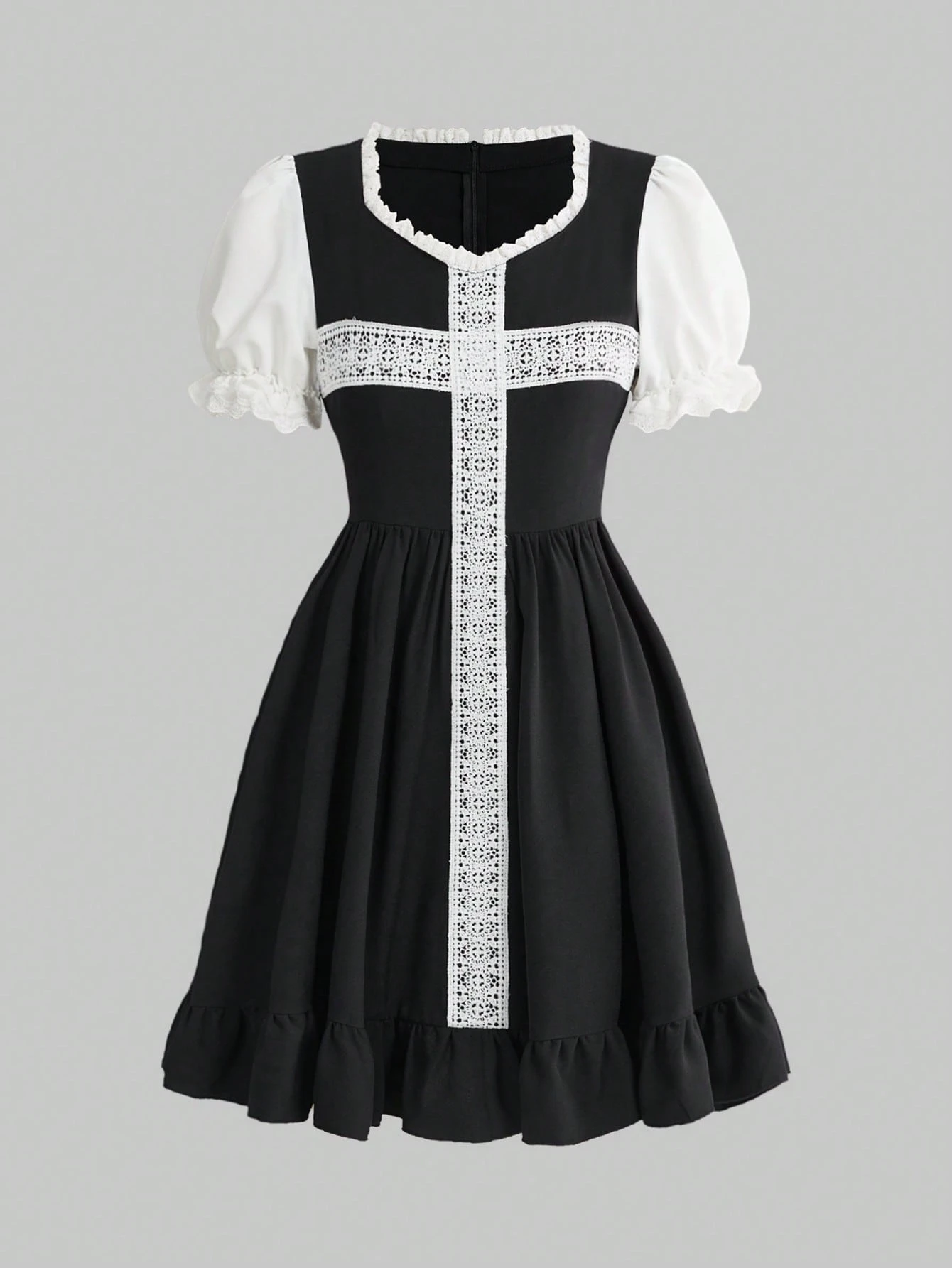 Spring/SummergraphicGothic Lolita Puff Sleeve Cross Lace Loose A-Line Dress, Spring/Summer