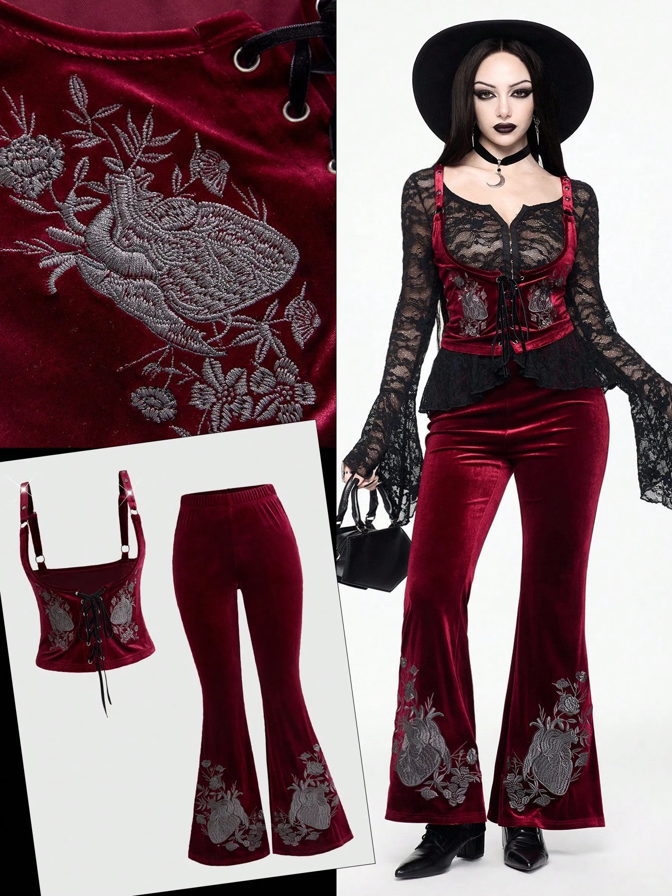 SpringGothic Heart & Floral Embroidery Velvet Women's Set