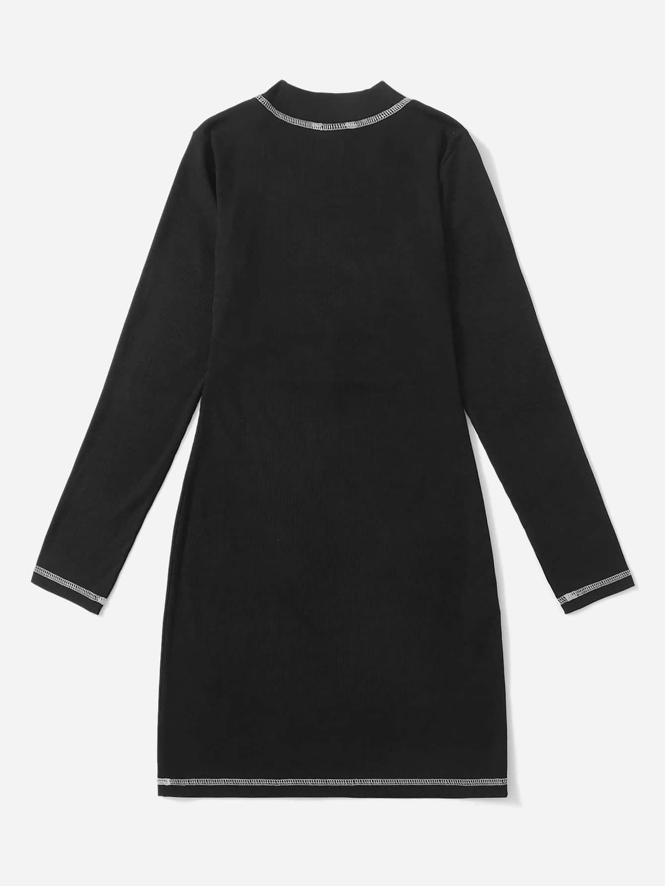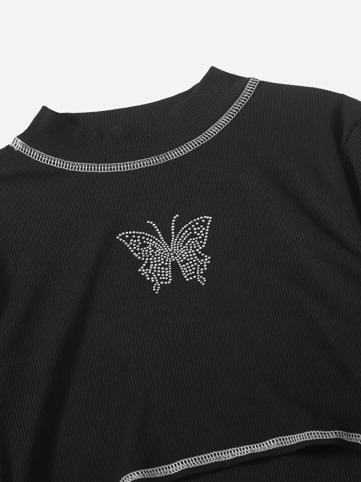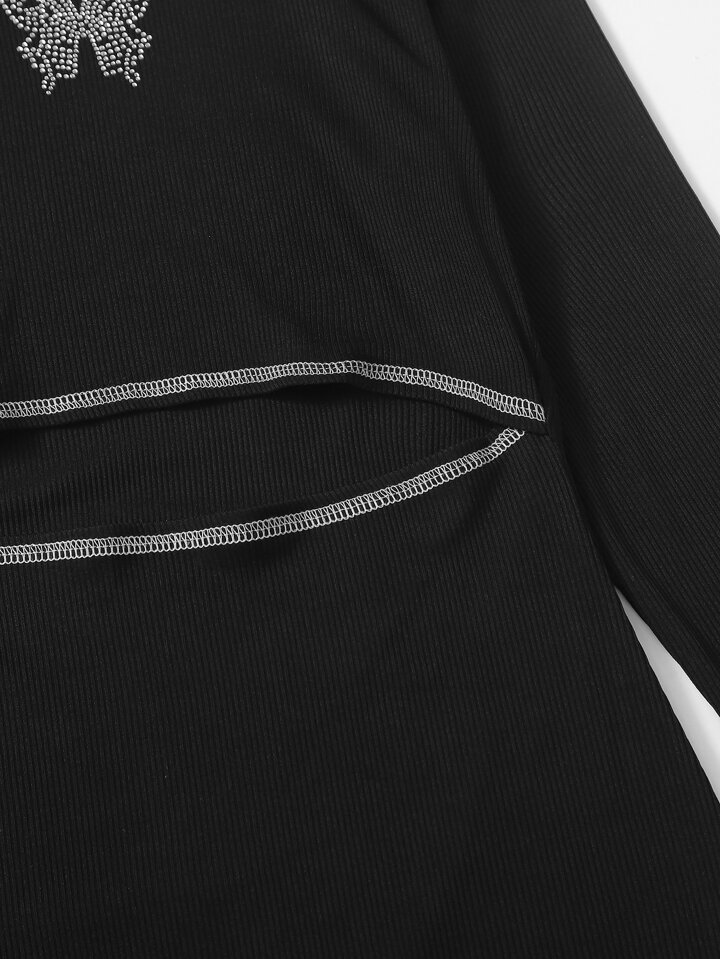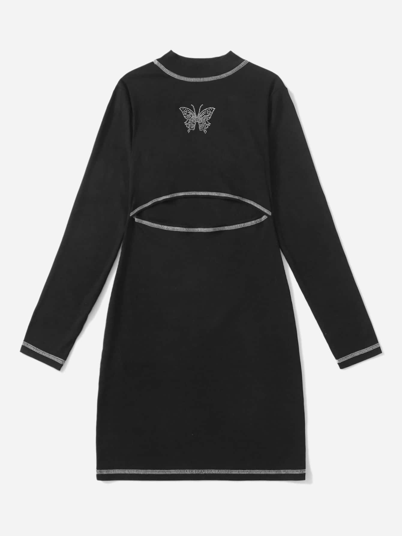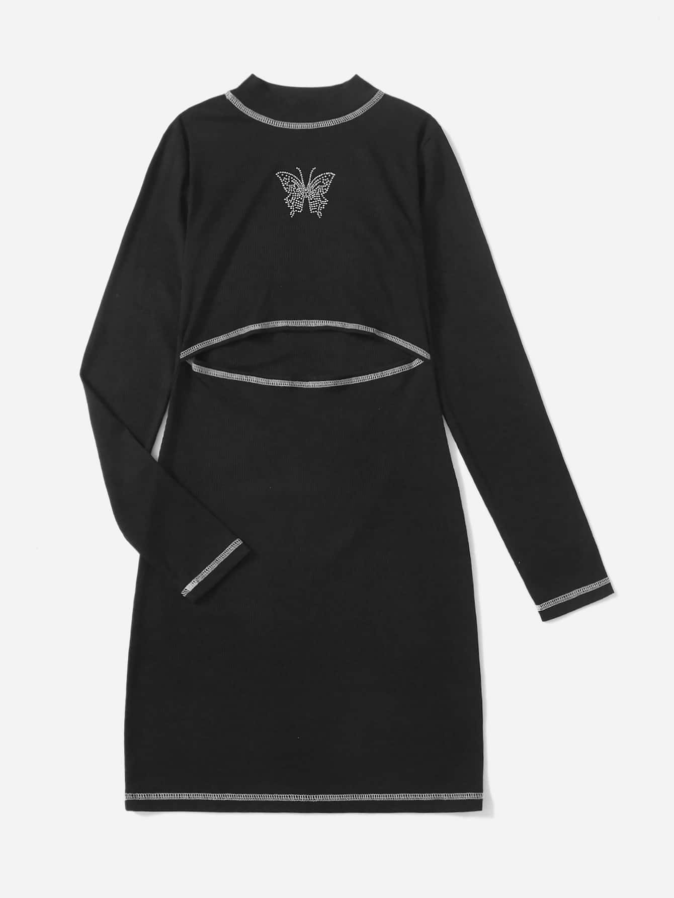 Stitching Trim Cut Out Butterfly Rhinestone Ribbed Dress