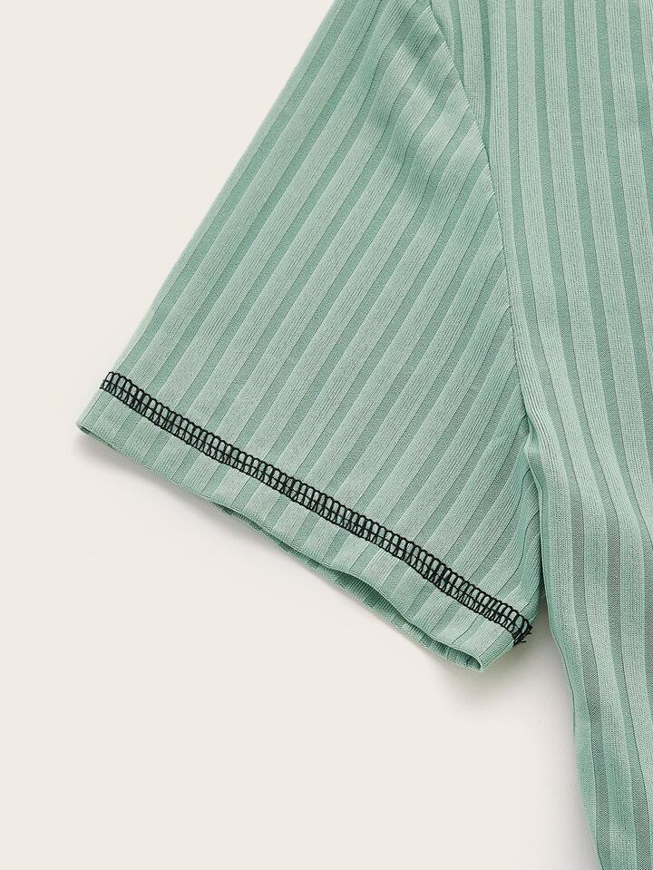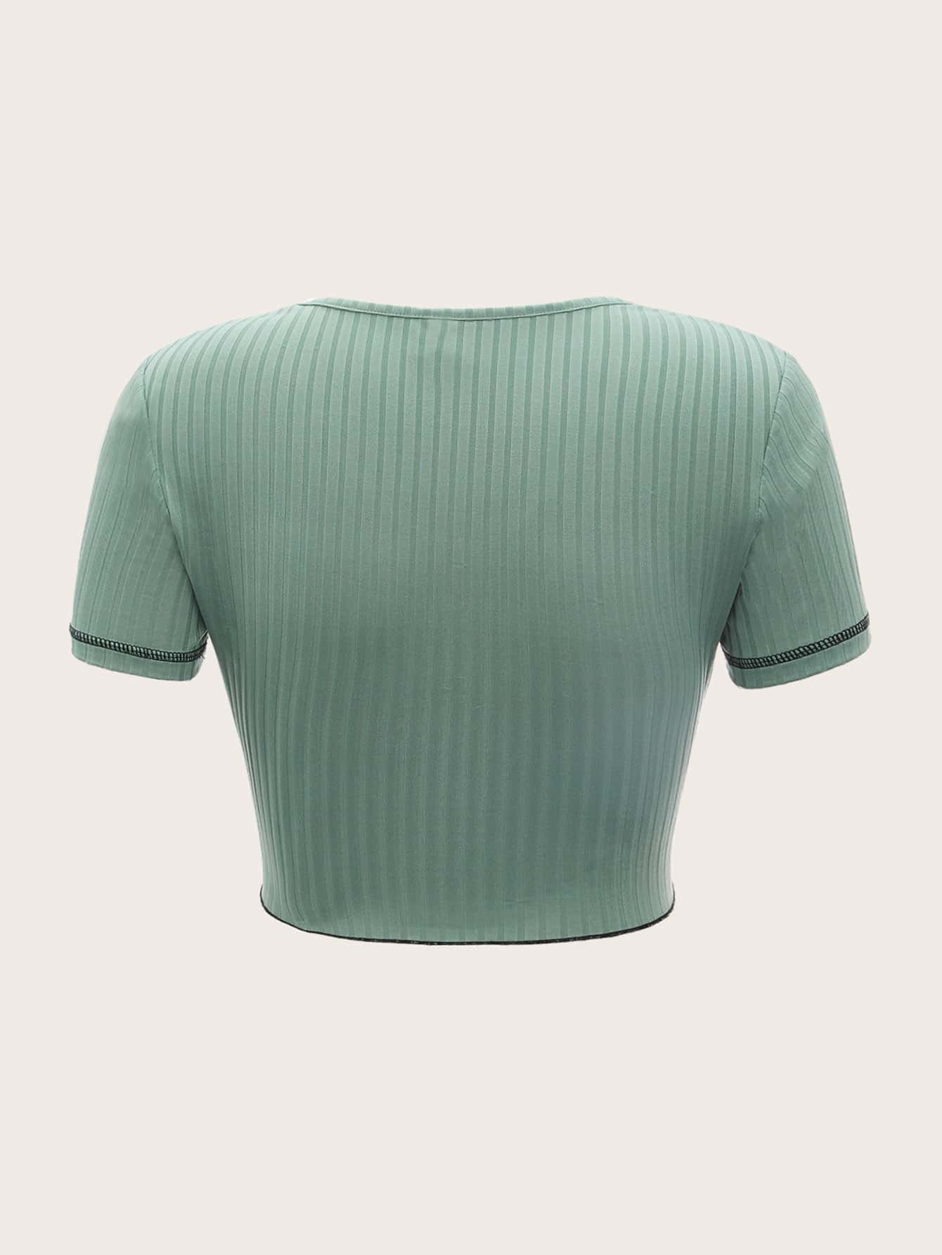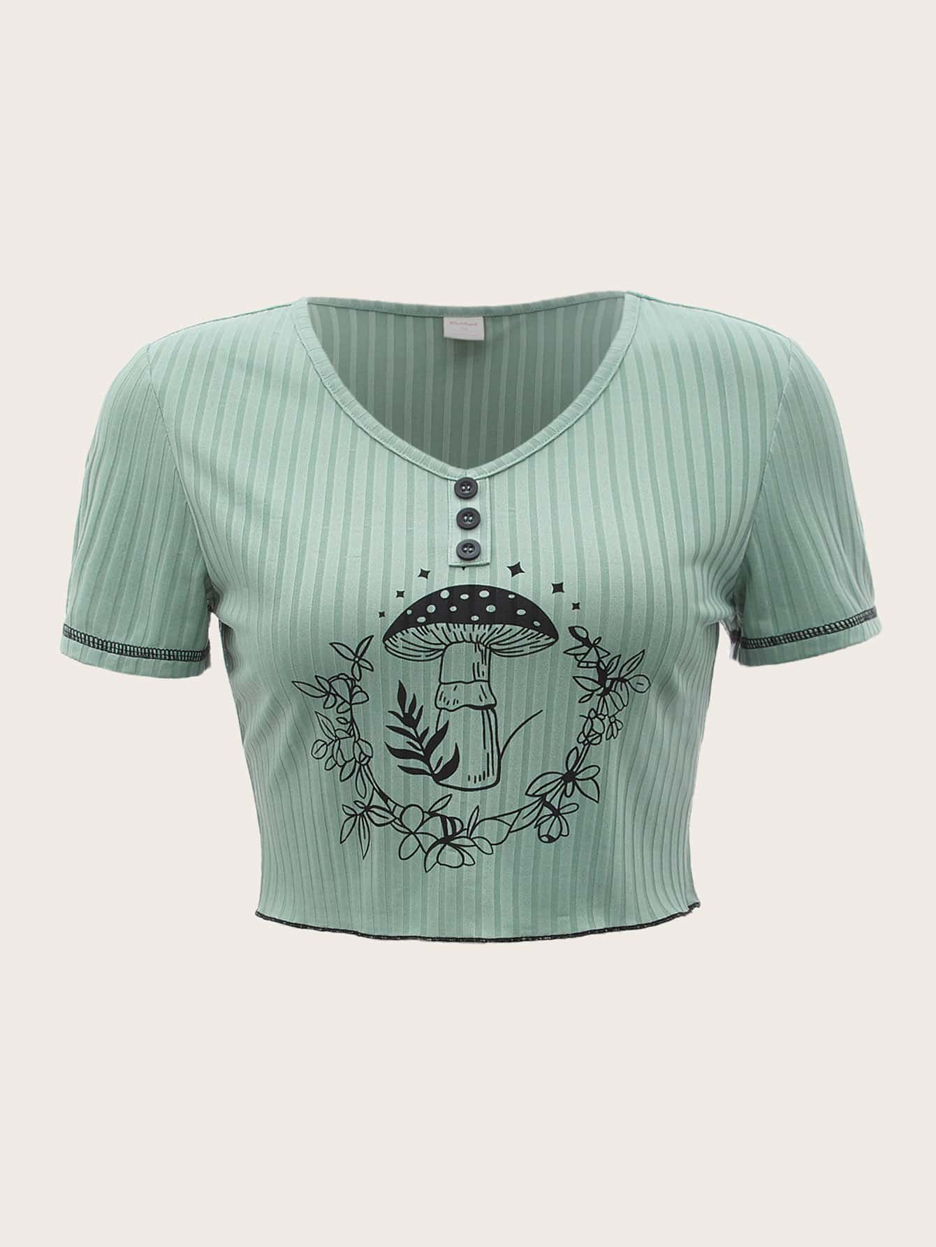 Stitching Trim Mushroom & Floral Graphic Button Ribbed Crop Tee