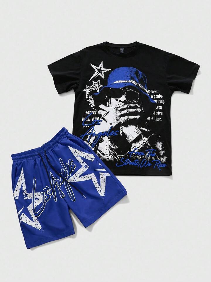 Street Life 2pcs Men's Casual Slogan Graphic T-Shirt And Shorts Set, Summer