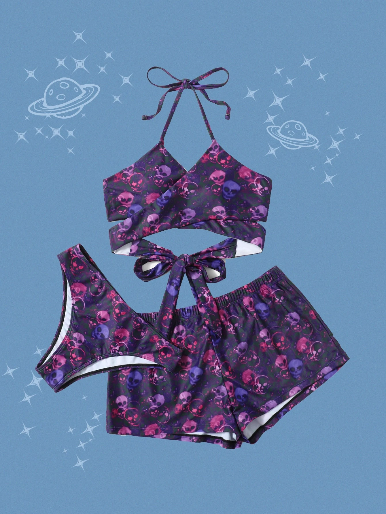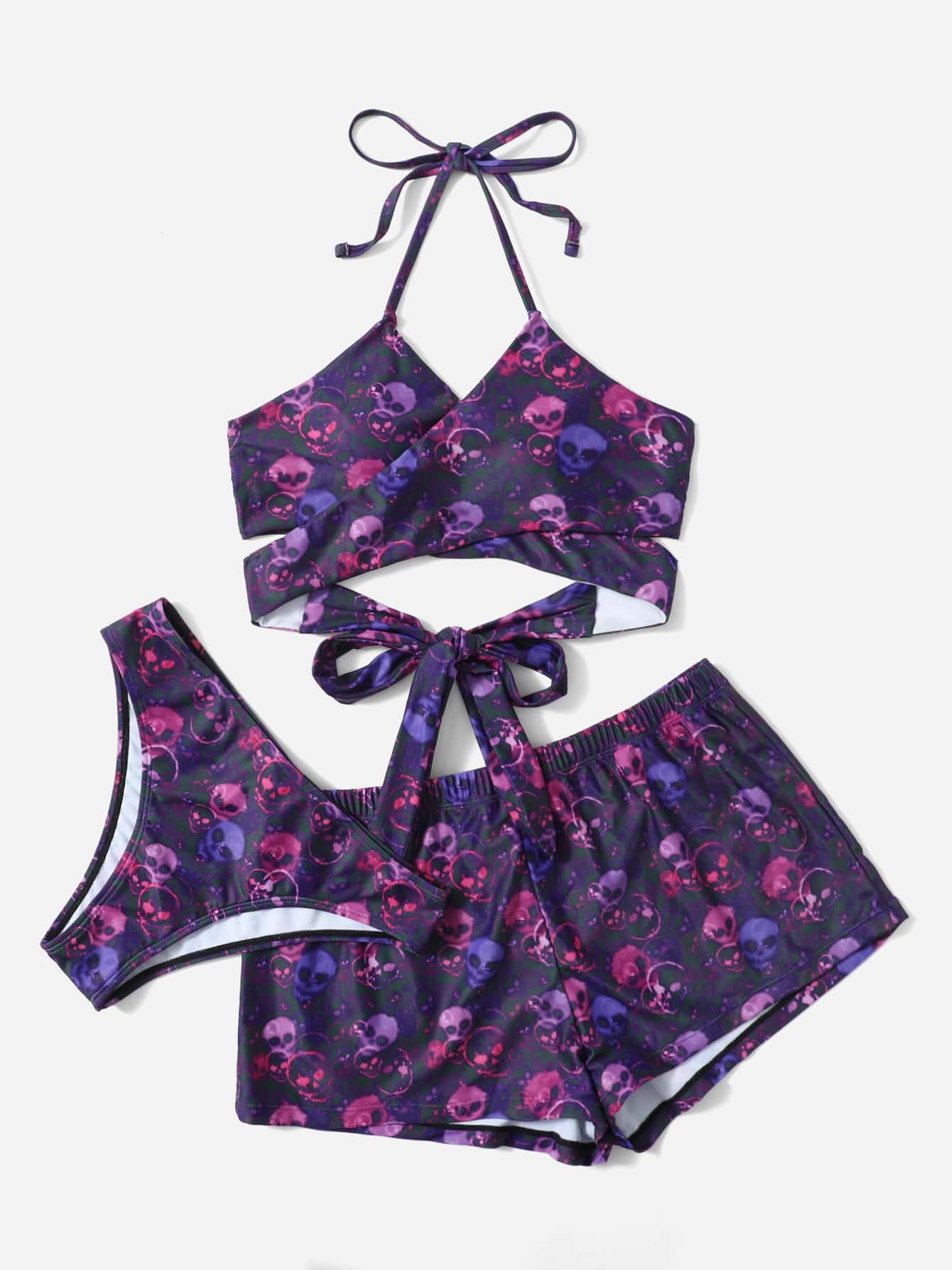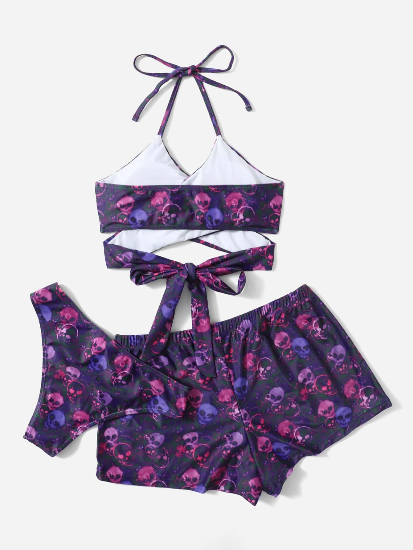 Street Life 3packs Skull Graphic Criss Cross Halter Bikini & Shorts