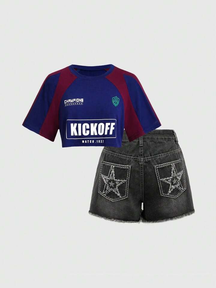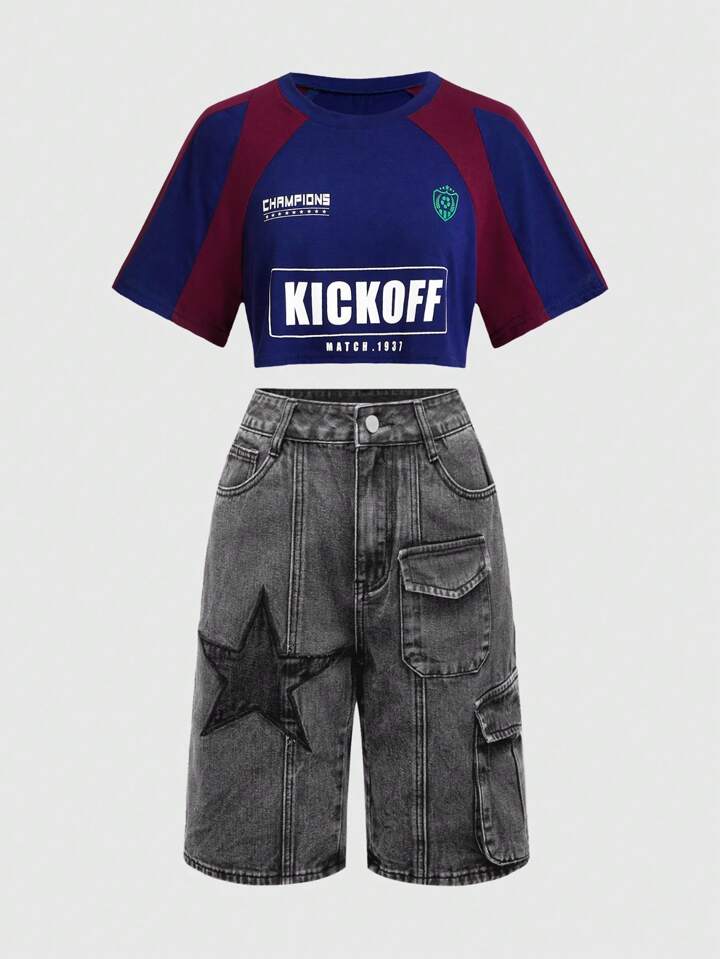 Street Life Casual Loose Fit Football Short Crop T-Shirt With Star & Letter Printed Design, School