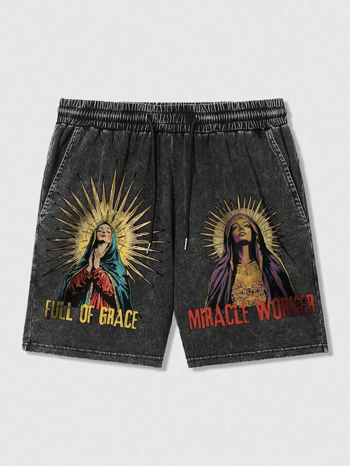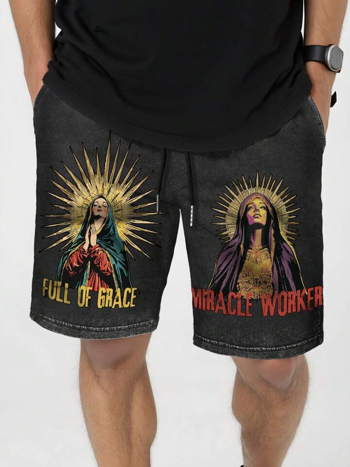 Street Life Goth Stylish Religious Character Casual Sports Men Shorts, Featuring An Illustration Depicting Virgin Mary