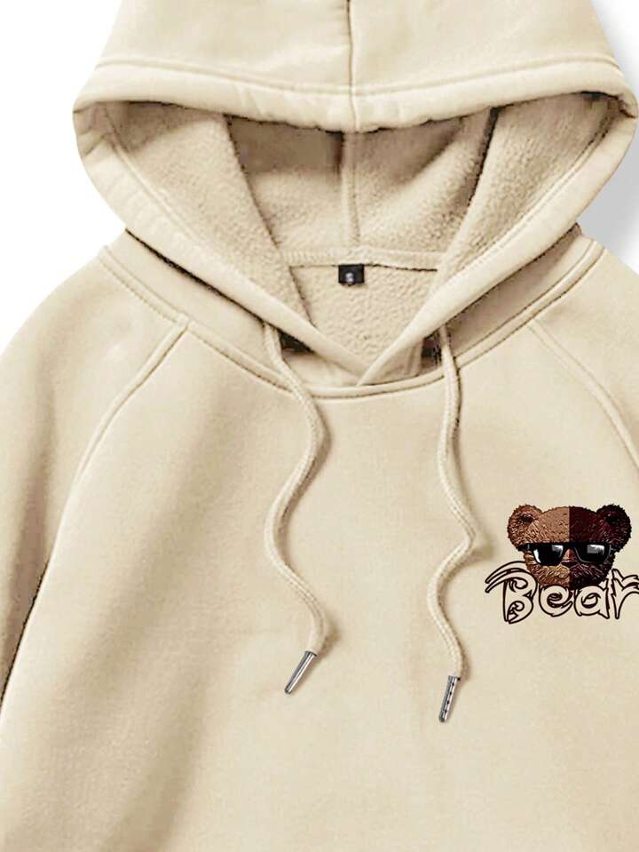Street Life Guys Letter Cartoon Bear Graphic Pocket Drawstring Thermal Hoodie