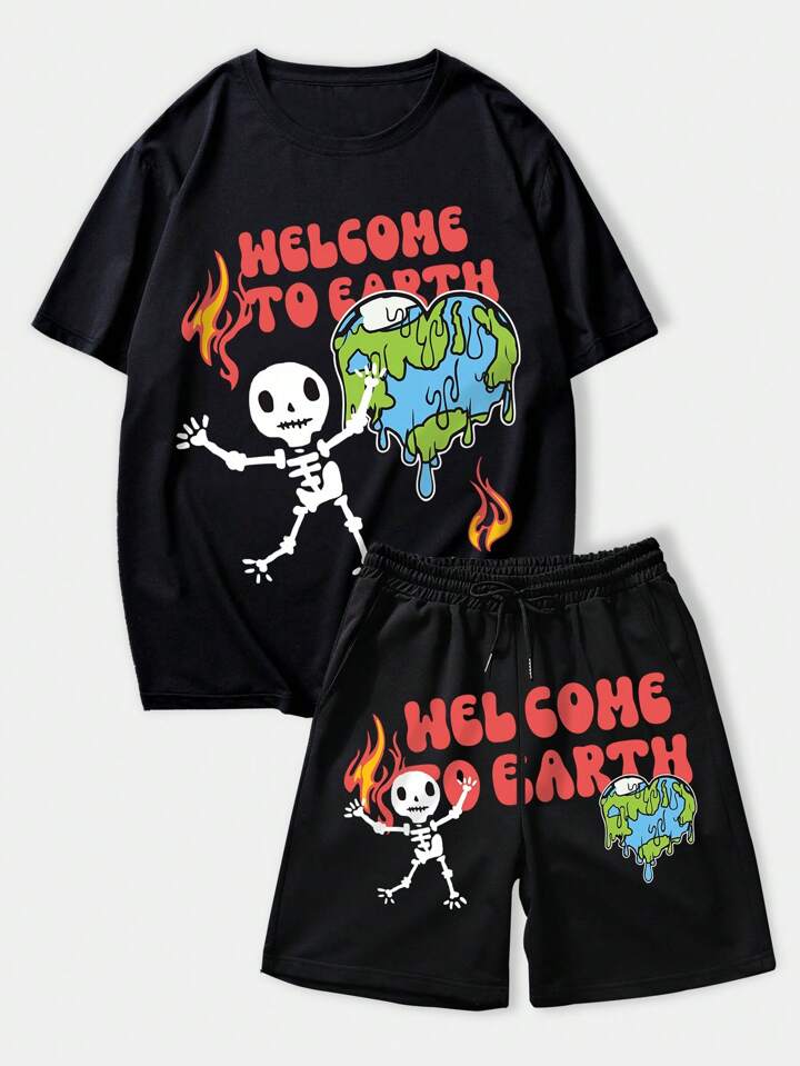 Street Life Guys Slogan & Skeleton Print Tee & Shorts
