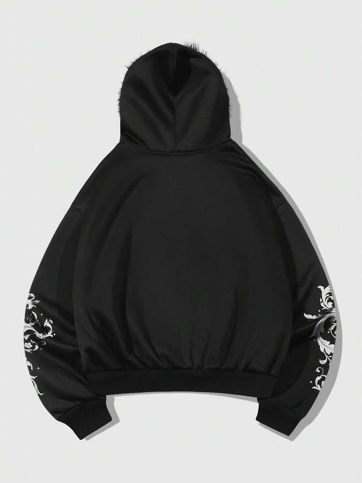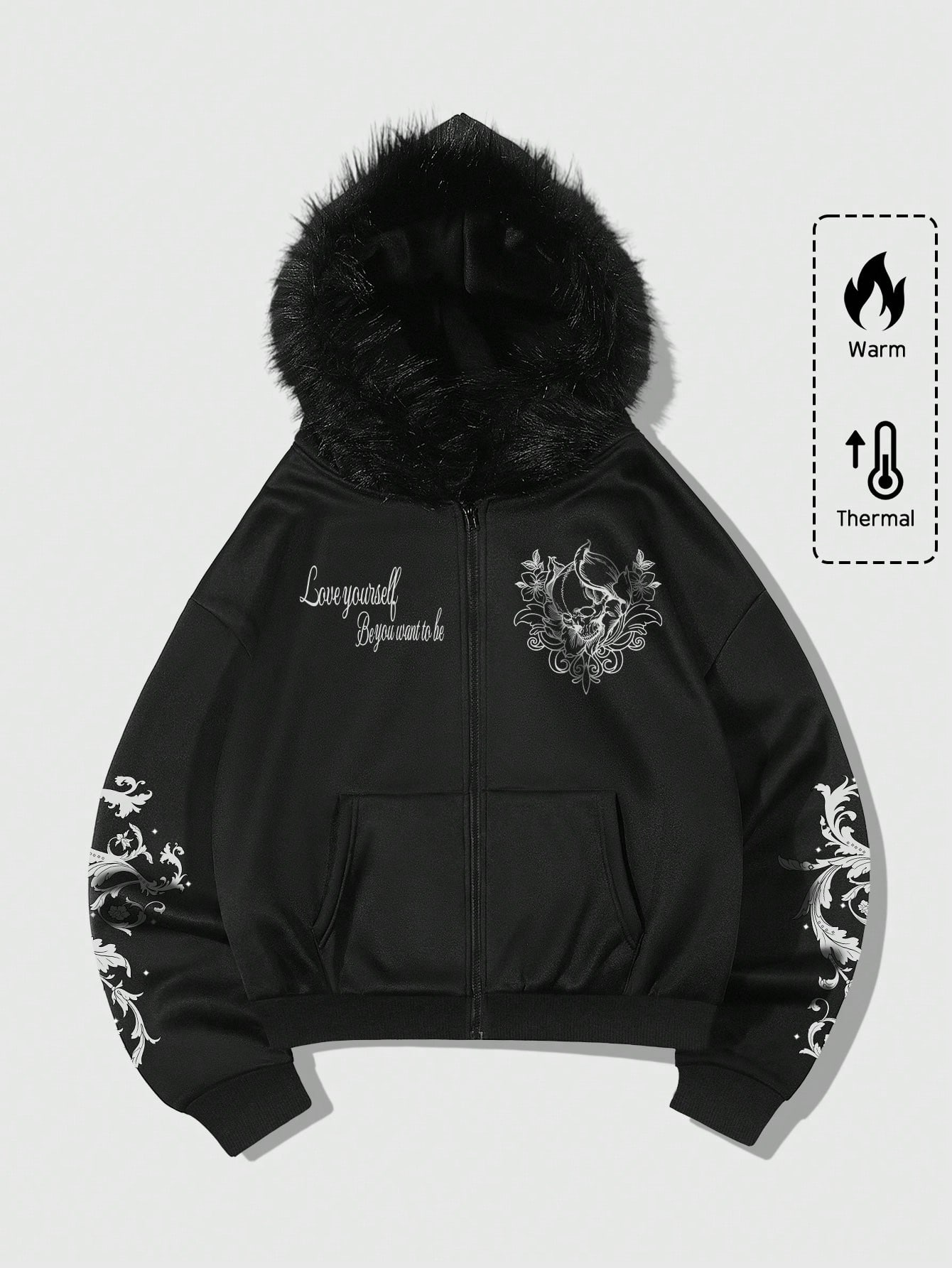 Street Life Loose Fit Thermal Lined Skull Hooded Sweatshirt Sweatshirt With Fur Trim