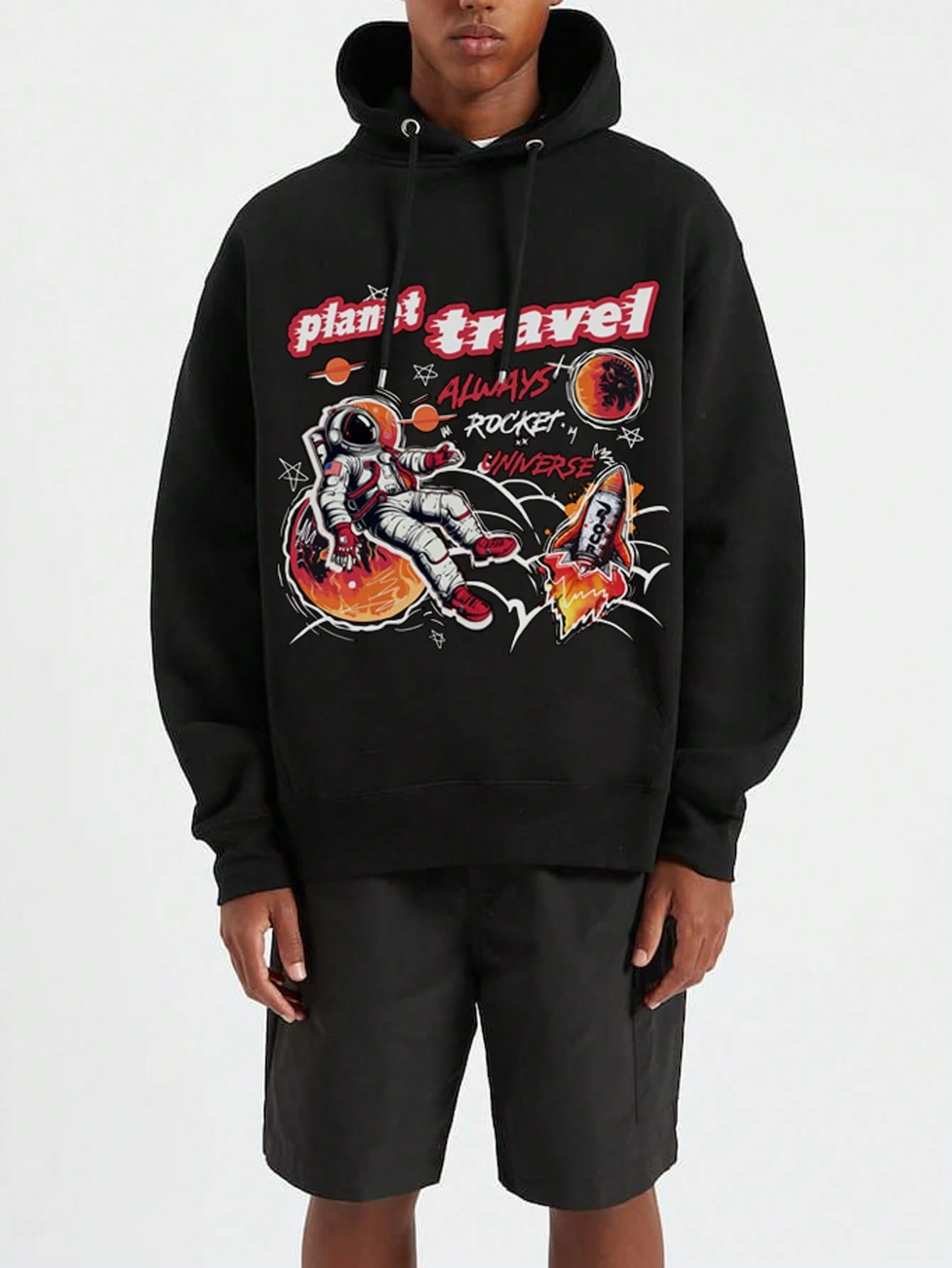 Street Life Men Letter & Cartoon Graphic Drawstring Hoodie