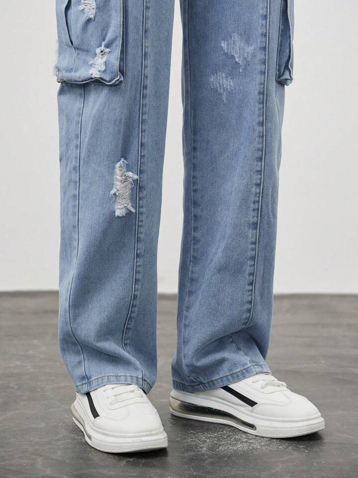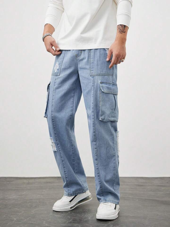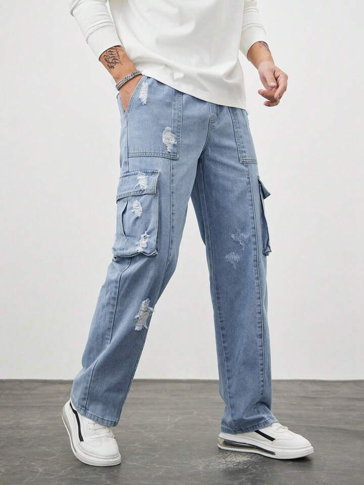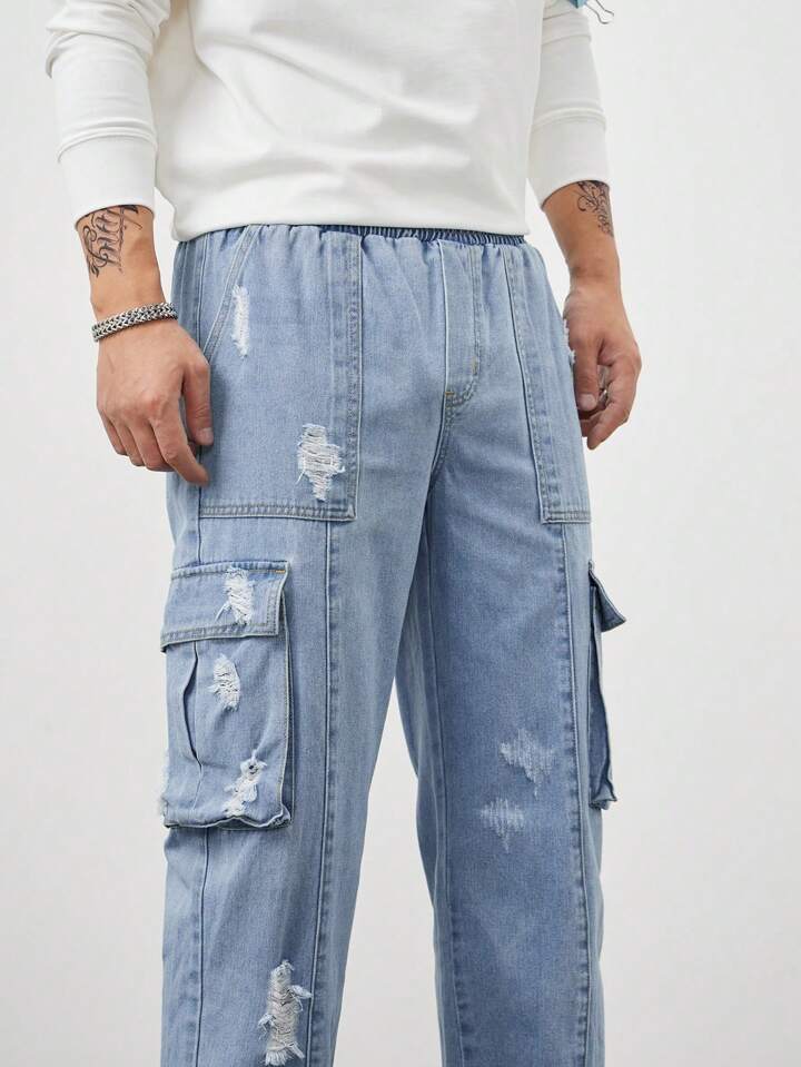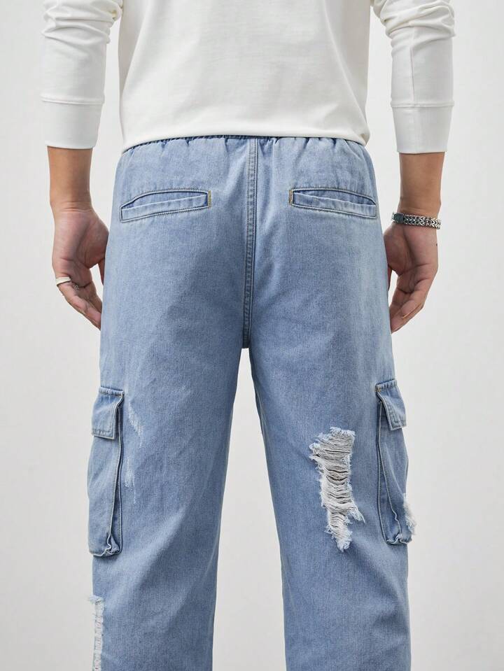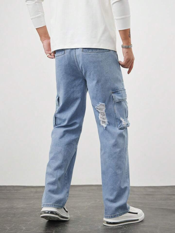 Street Life Men Ripped Flap Pocket Side Cargo Jeans