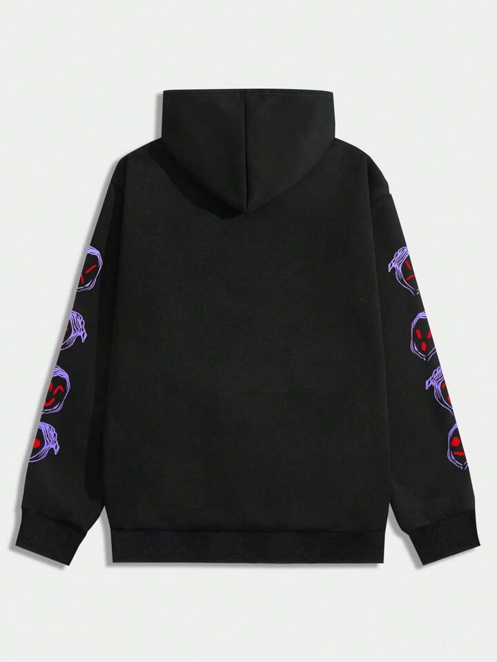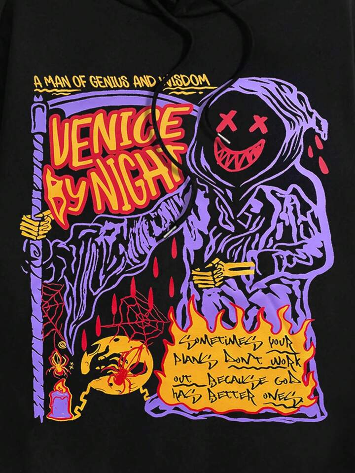 Street Life Men Slogan & Cartoon Graphic Drawstring Hoodie