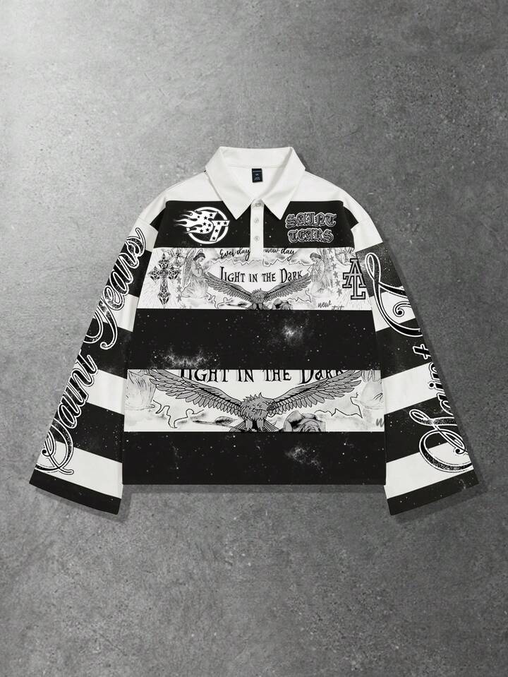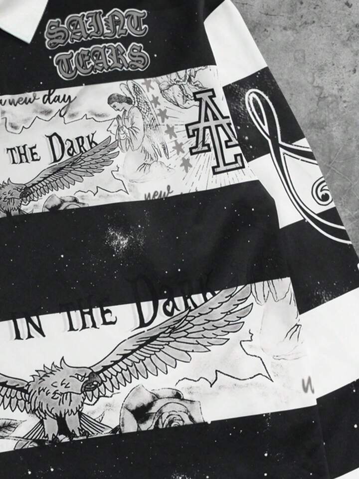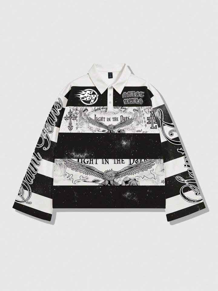 Street Life Men Striped Collar Long Sleeve Printed T-Shirt, Casual College Style Top, Fall