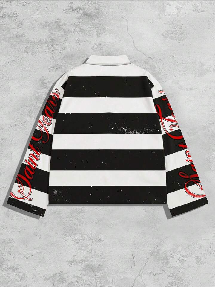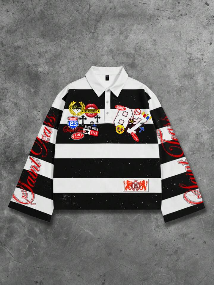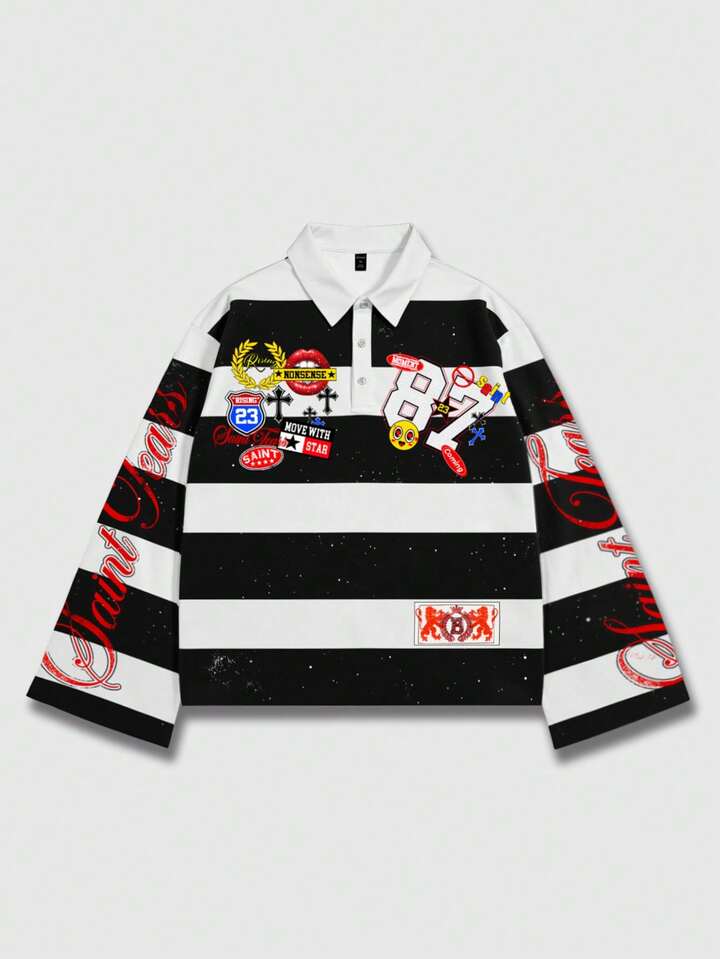 Street Life Men Striped Collar Prep Long Sleeve Printed T-Shirt, Casual College Style Top, Fall