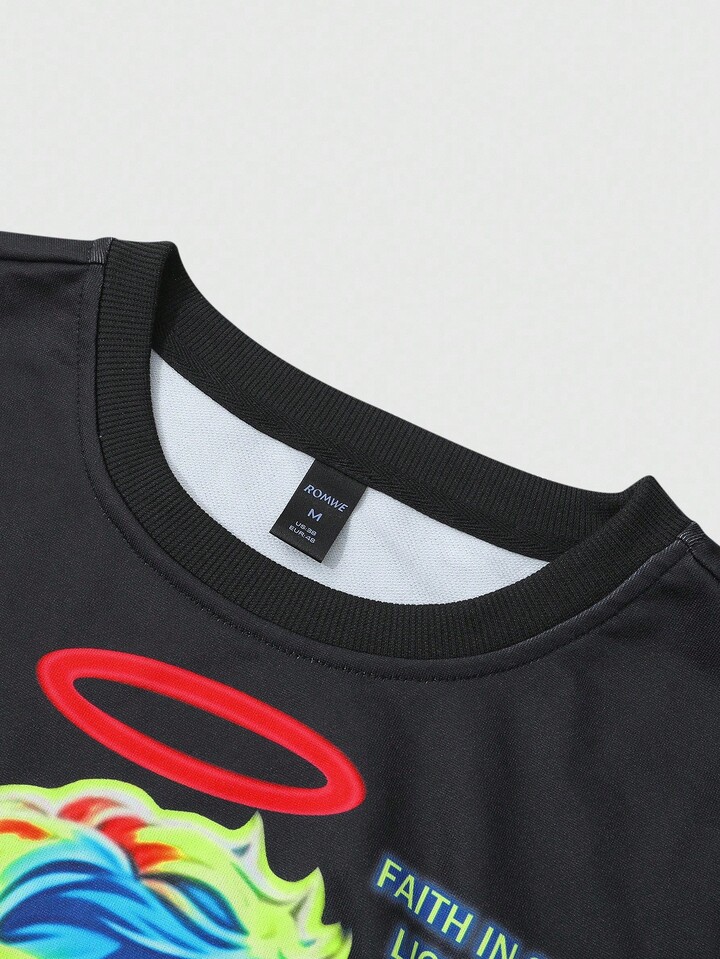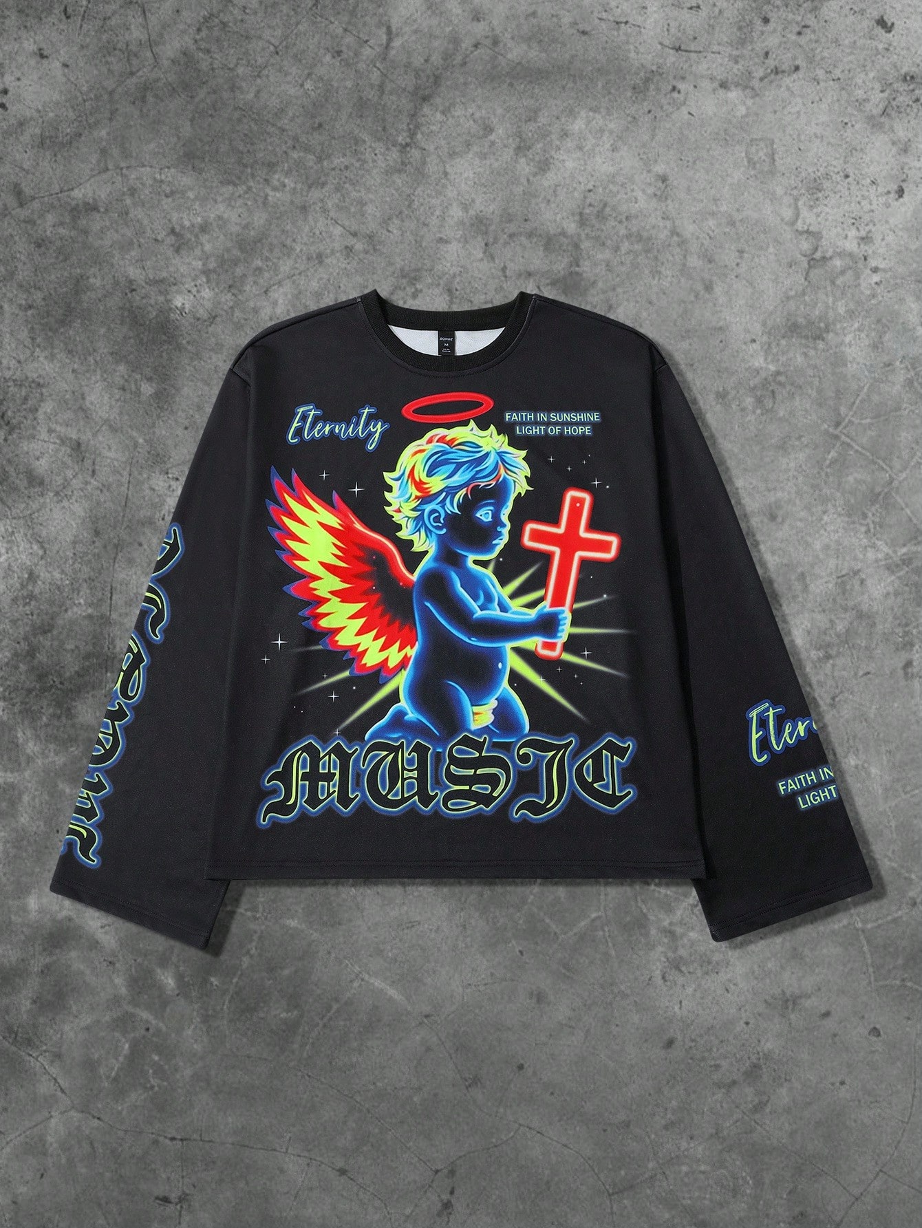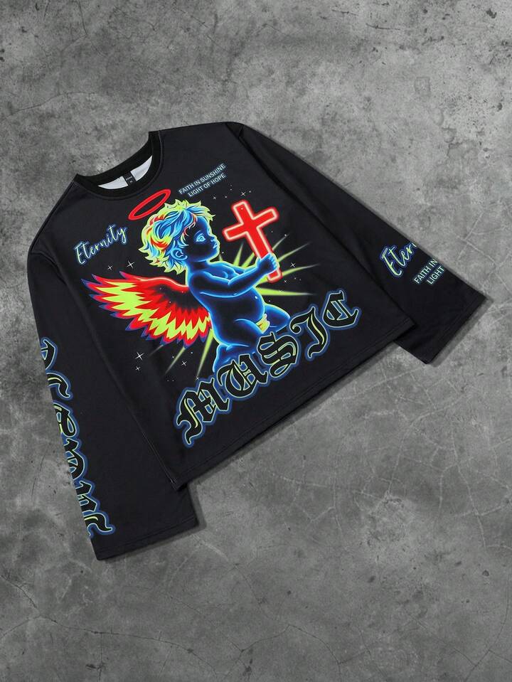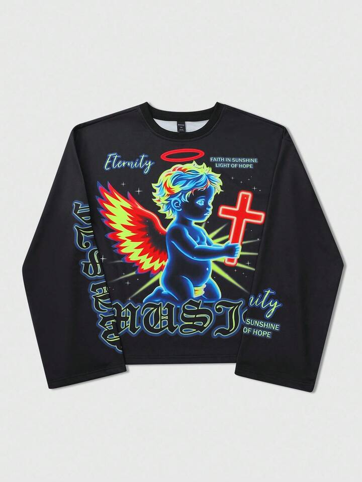 Street Life Men's Angel Letter Print Round Neck Long Sleeve Casual T-Shirt