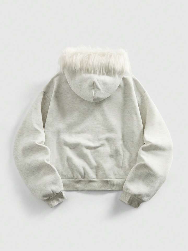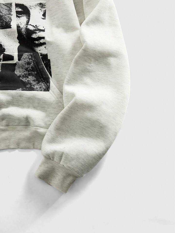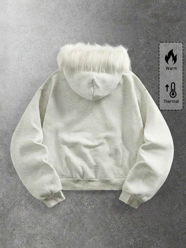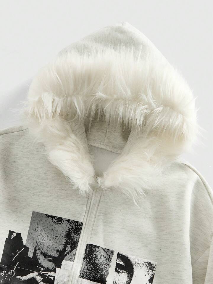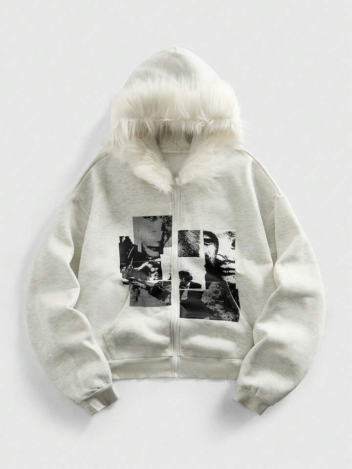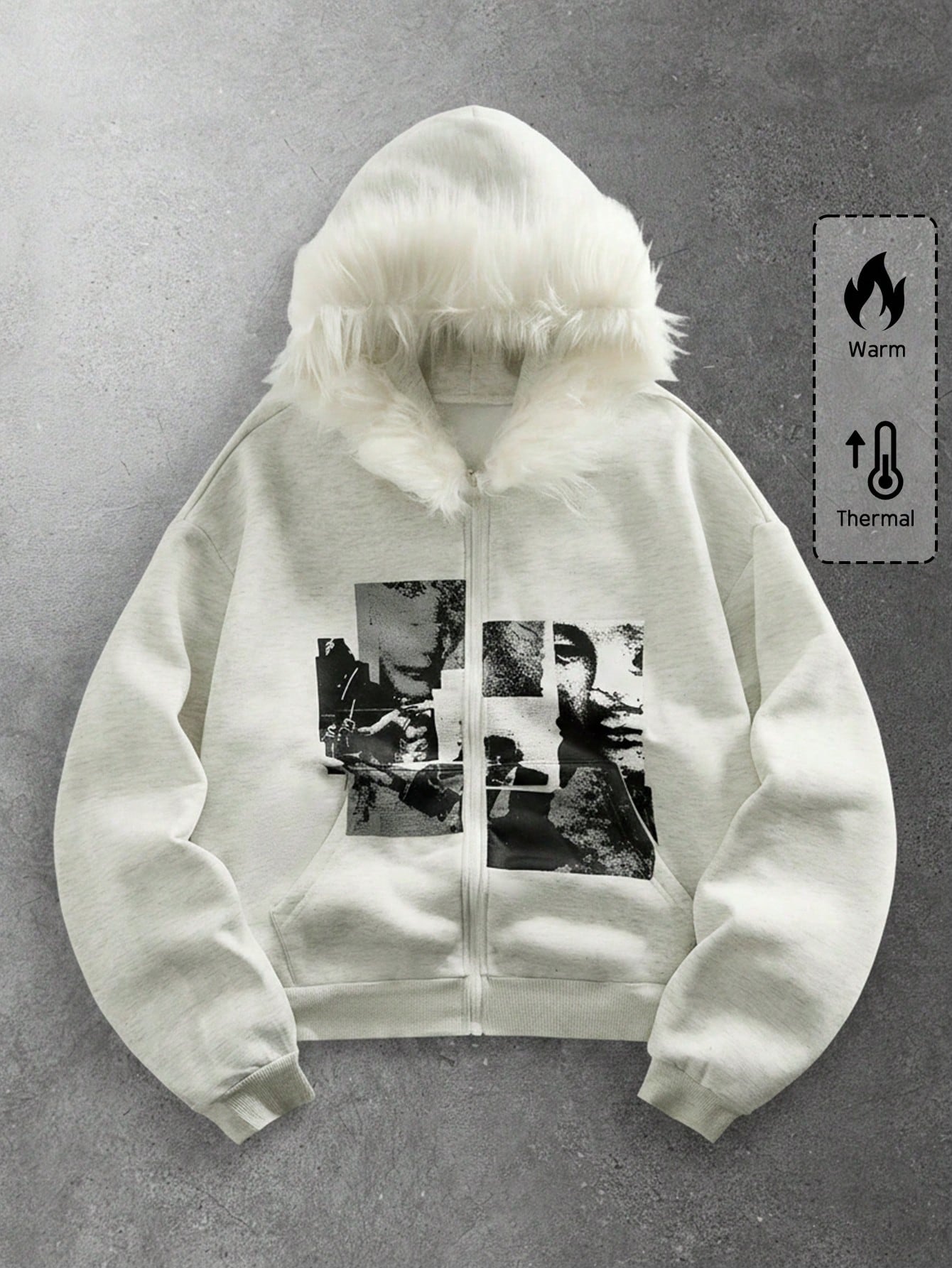 Street Life Men's Autumn/Winter Graphic Print Long Sleeve Hooded Sweatshirt With Zipper Closure And Fluffy Collar