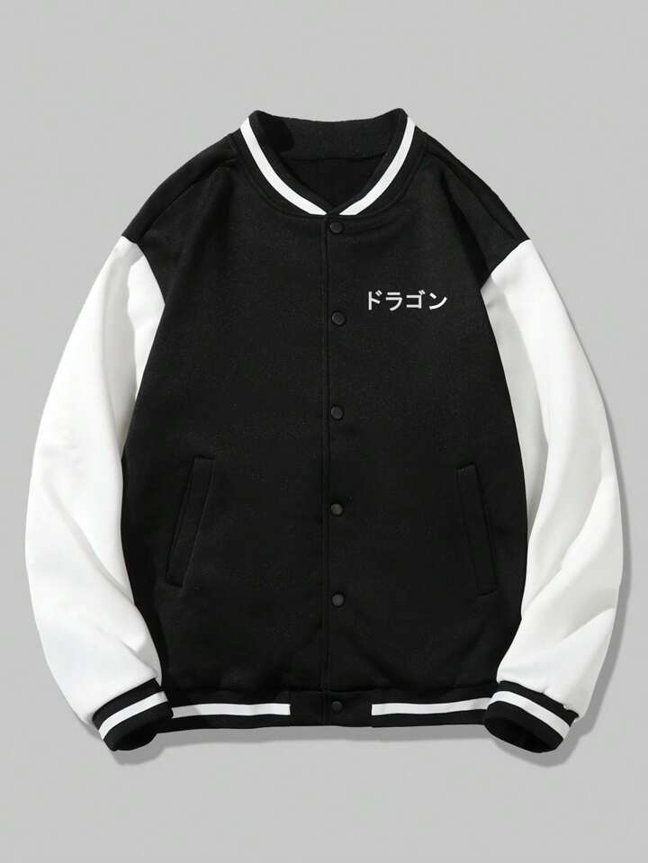 Street Life Men's Back Dragon Printed Black & White Color Blocking Baseball Jacket