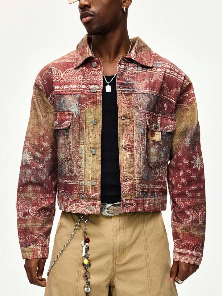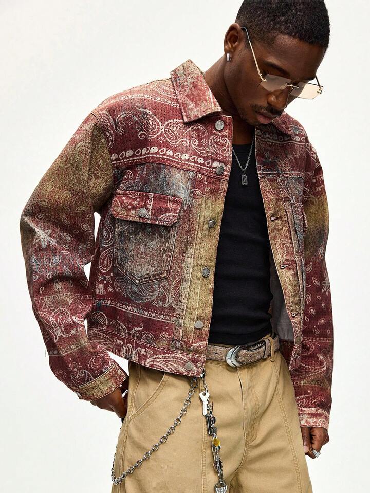 Street Life Men's Casual Cashew Print Long Sleeve Single-Breasted Denim Jacket With Pockets