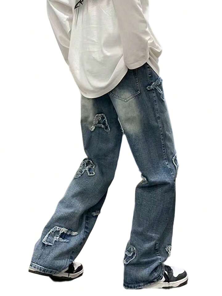 Street Life Men's Casual Frayed Baggy Jeans With Letter Patchwork