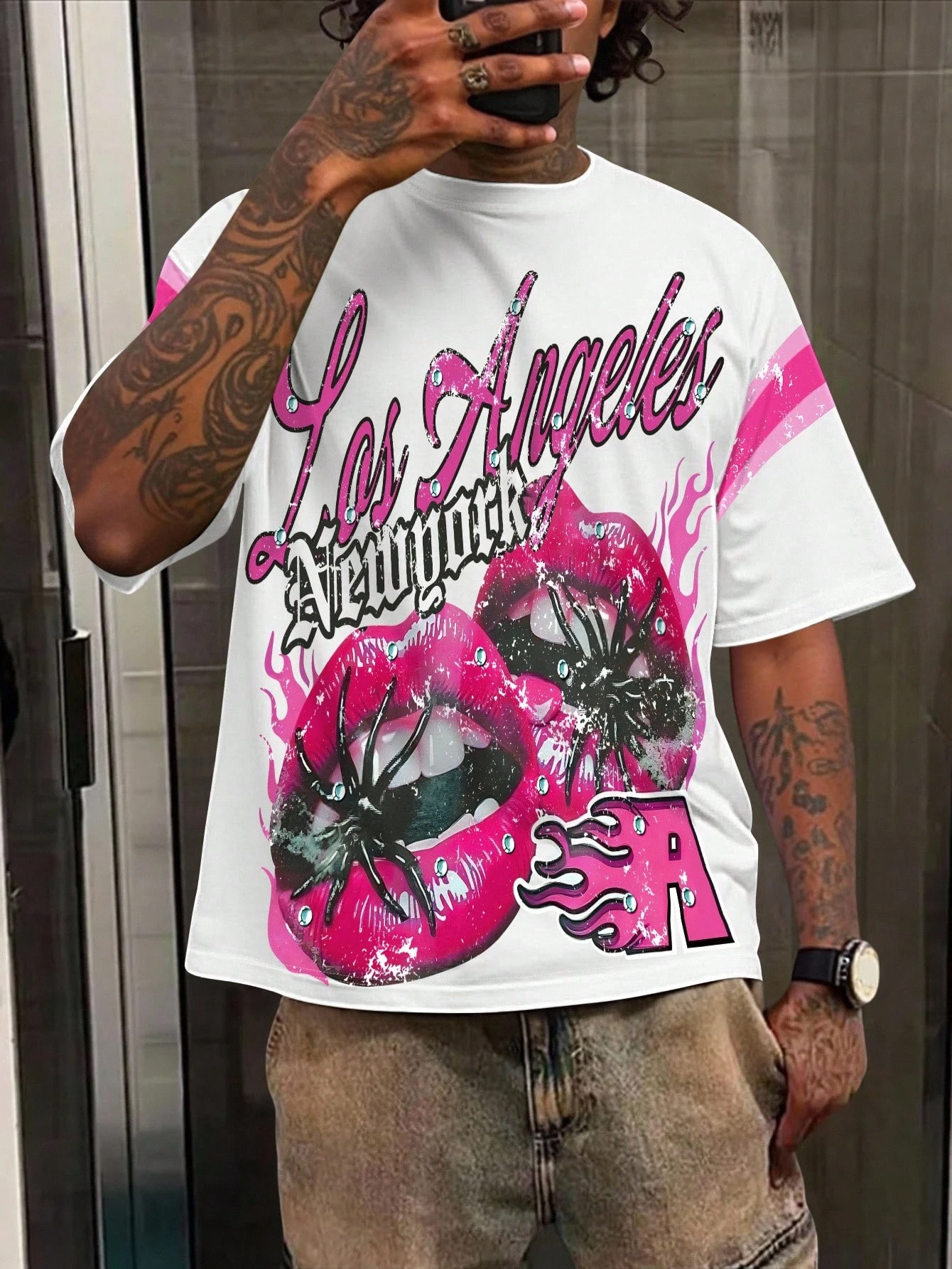 Street Life Men's Casual Lip & Letter Print Round Neck Short Sleeve T-Shirt, Summer, 2000s Style