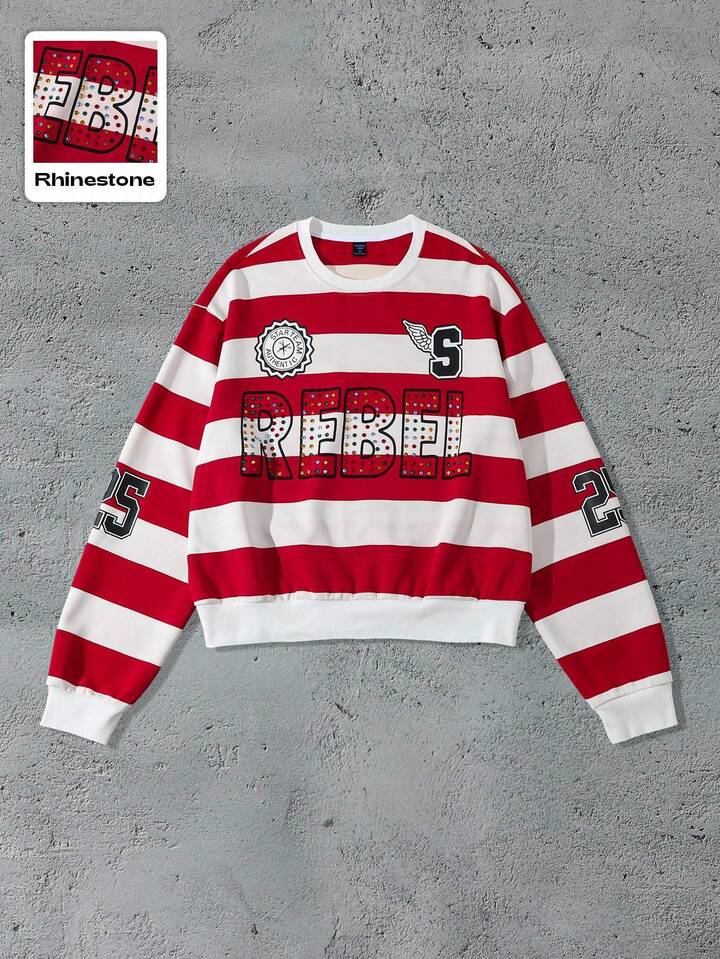 Street Life Men's Casual Loose Fit Rhinestone Embellished Striped Crew Neck Sweatshirt, Autumn