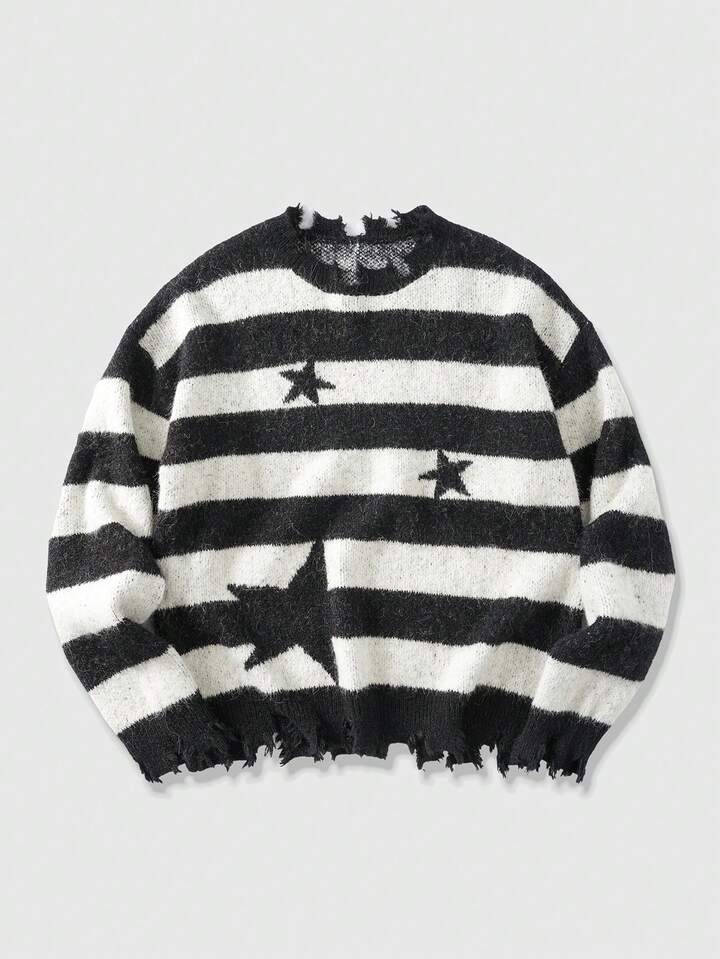 Street Life Men's Casual Punk Fashion Street Black & White Striped And Star Pattern Distressed Edge Loose Fit Sweater, Autumn/Winter