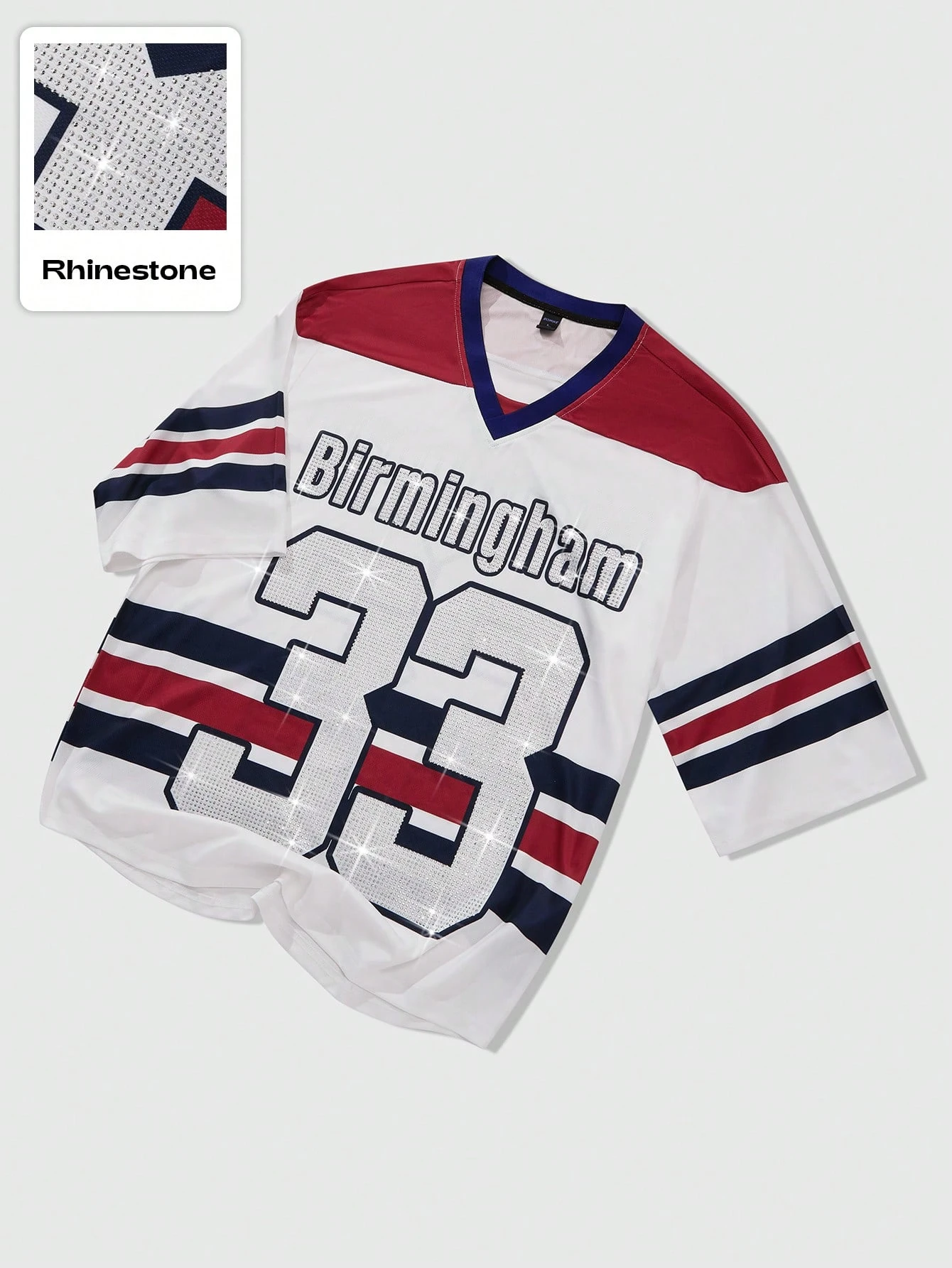 Street Life Men's Casual Sports Letter & Number Rhinestone Striped Contrast Color Short Sleeve T-Shirt, Rave