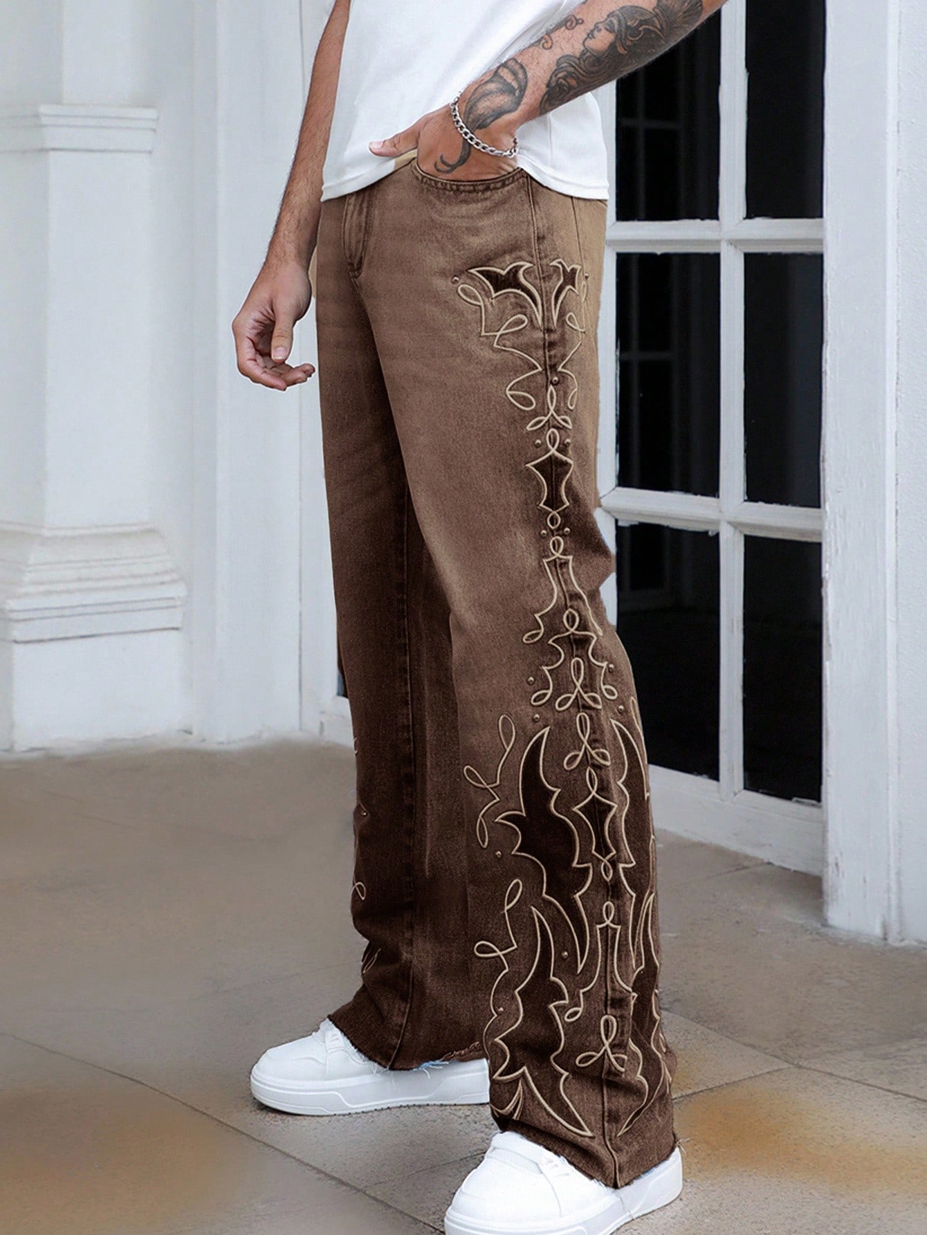 Street Life Men's Casual Washed Embroidered Patch & Rivet Decorated Denim Jeans