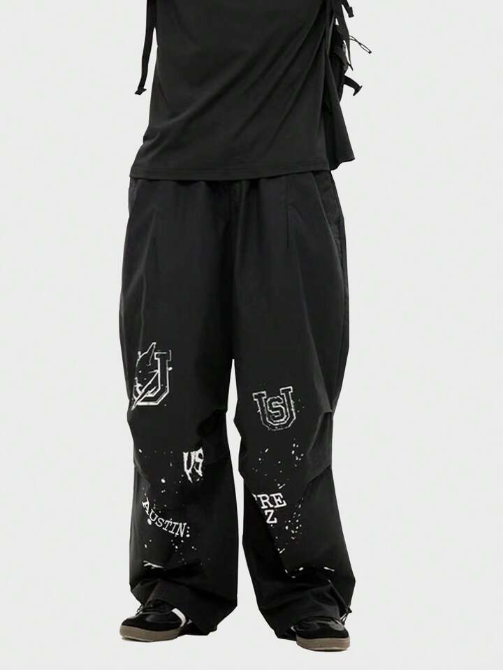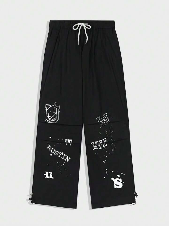Street Life Men's Casual Wide Leg Pants With Letter Printed Slanted Pockets