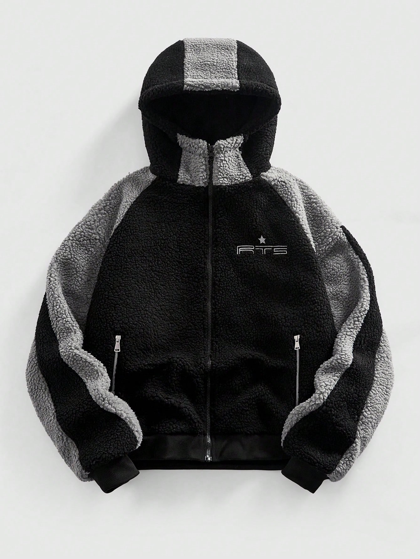 Spring Casual Graphic Men'S Casual Zip-Up Contrast Color Sherpa Jacket, Autumn/Winter