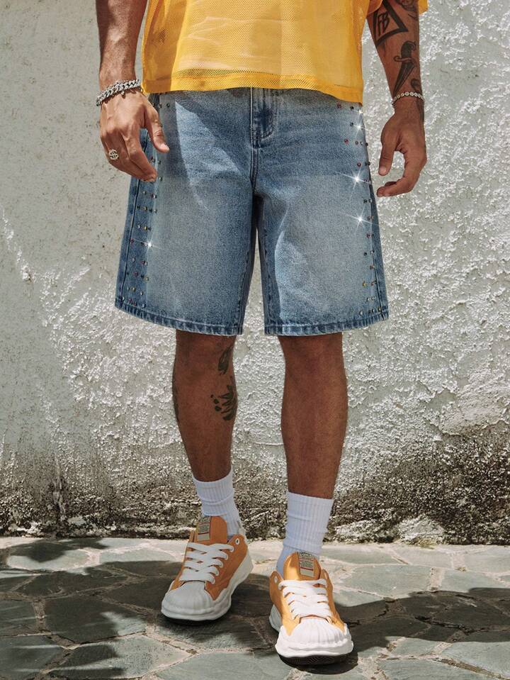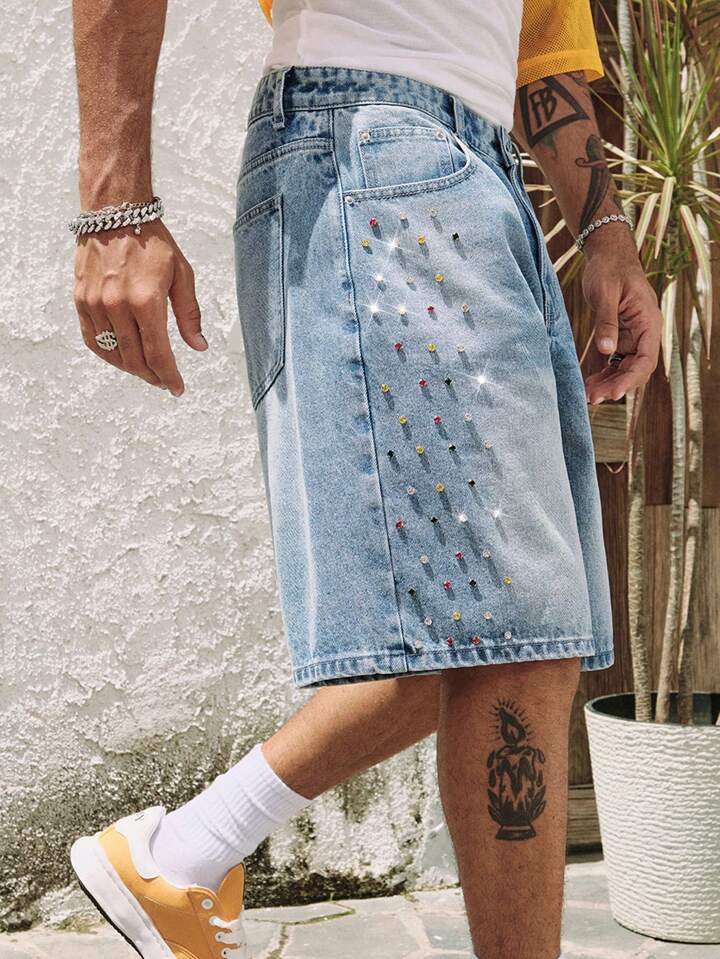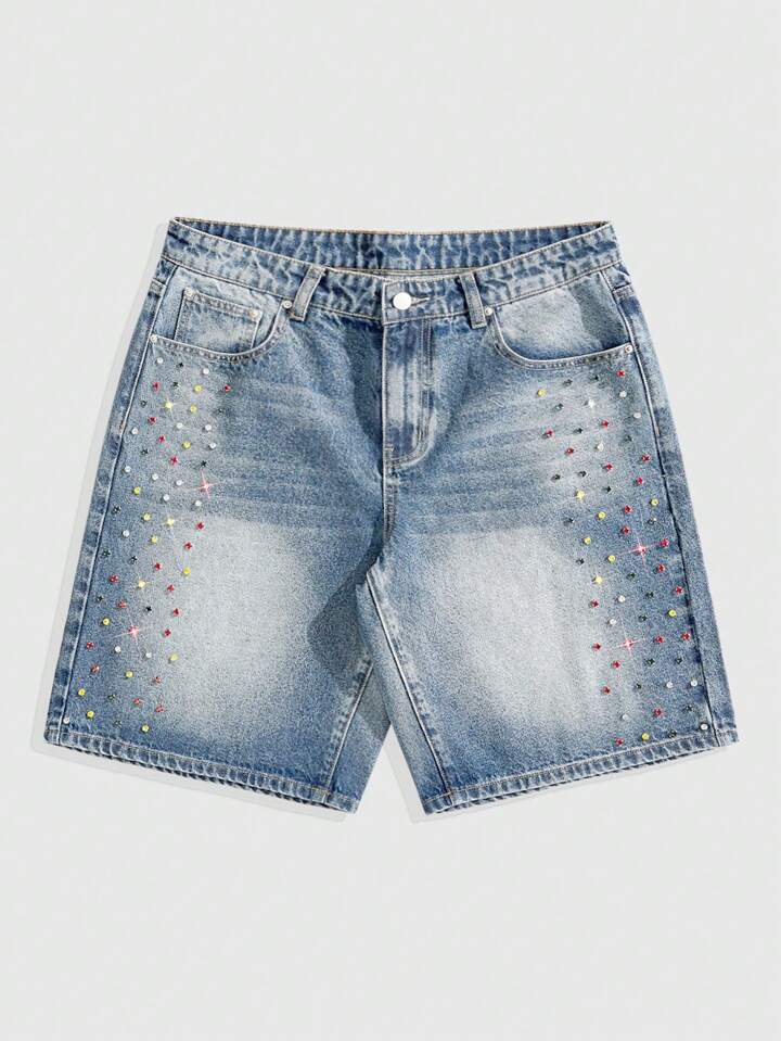 Street Life Men's Colorful Rhinestone Decor Loose Fit Denim Shorts Jorts