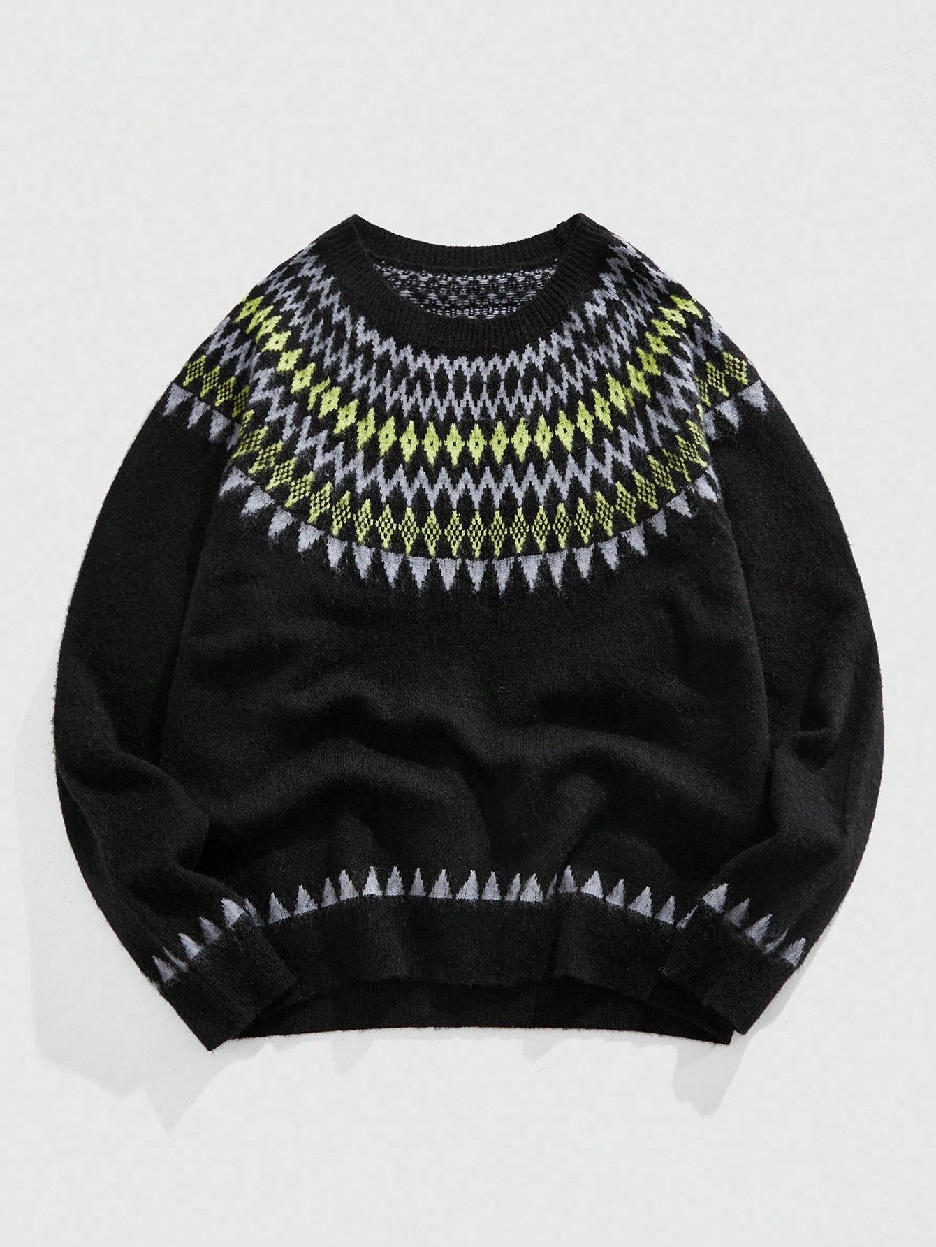 Street Life Men's Crew Neck Contrast Color Jacquard Casual Knit Sweater, Fall Winter