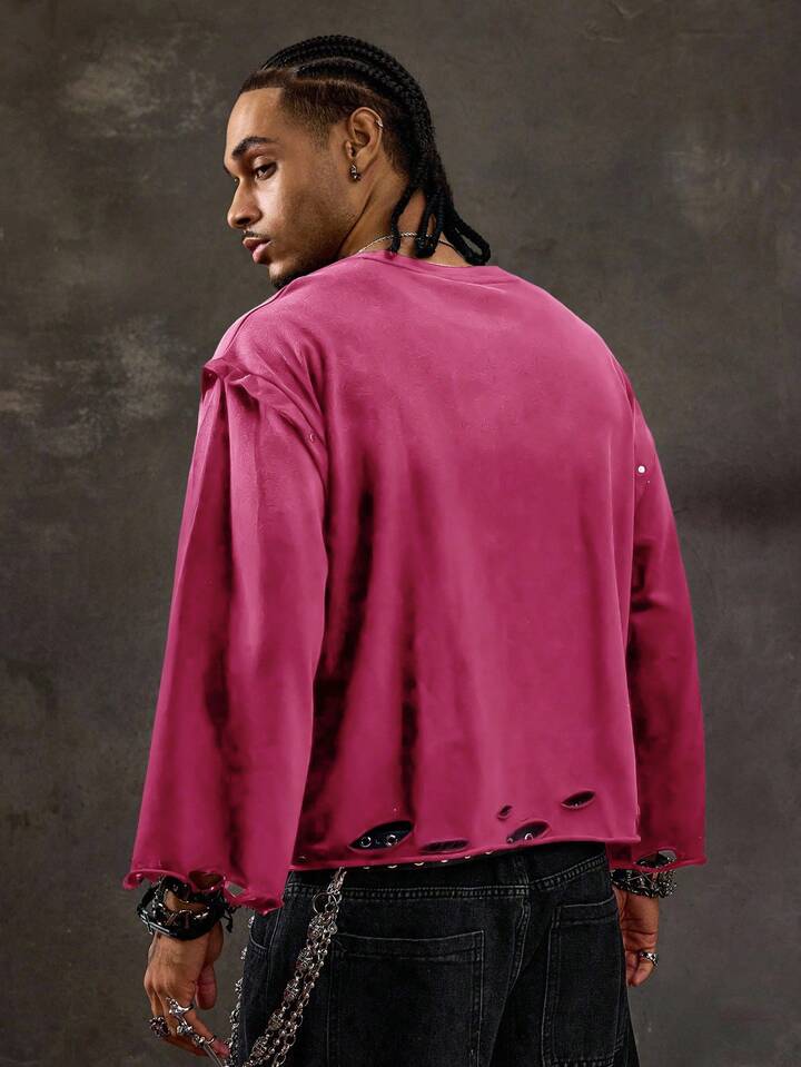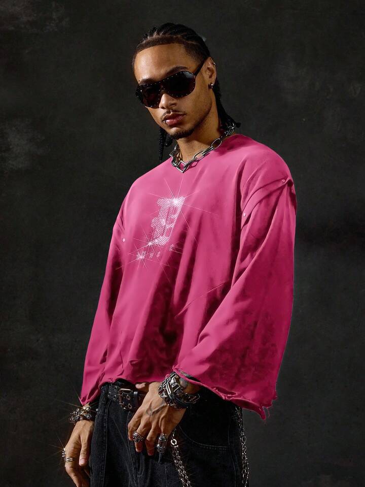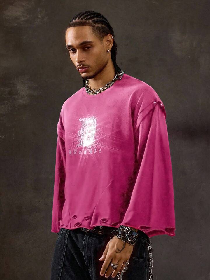 Street Life Men's Distressed Diamond Print Long Sleeve T-Shirt, Loose Cropped Fit