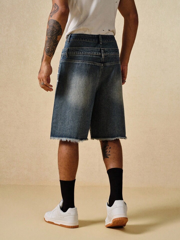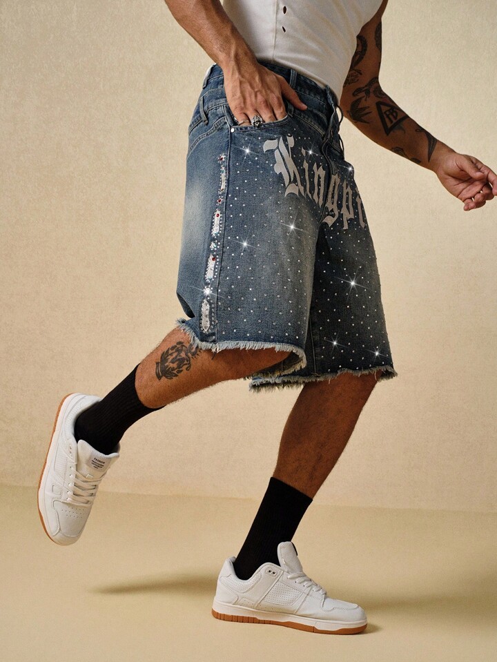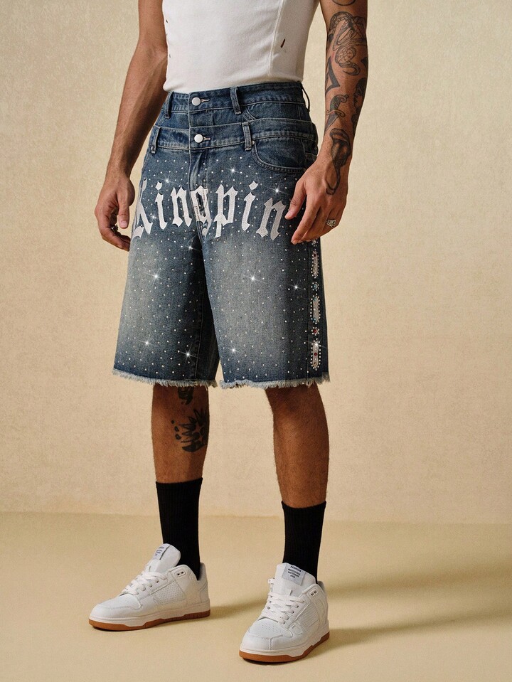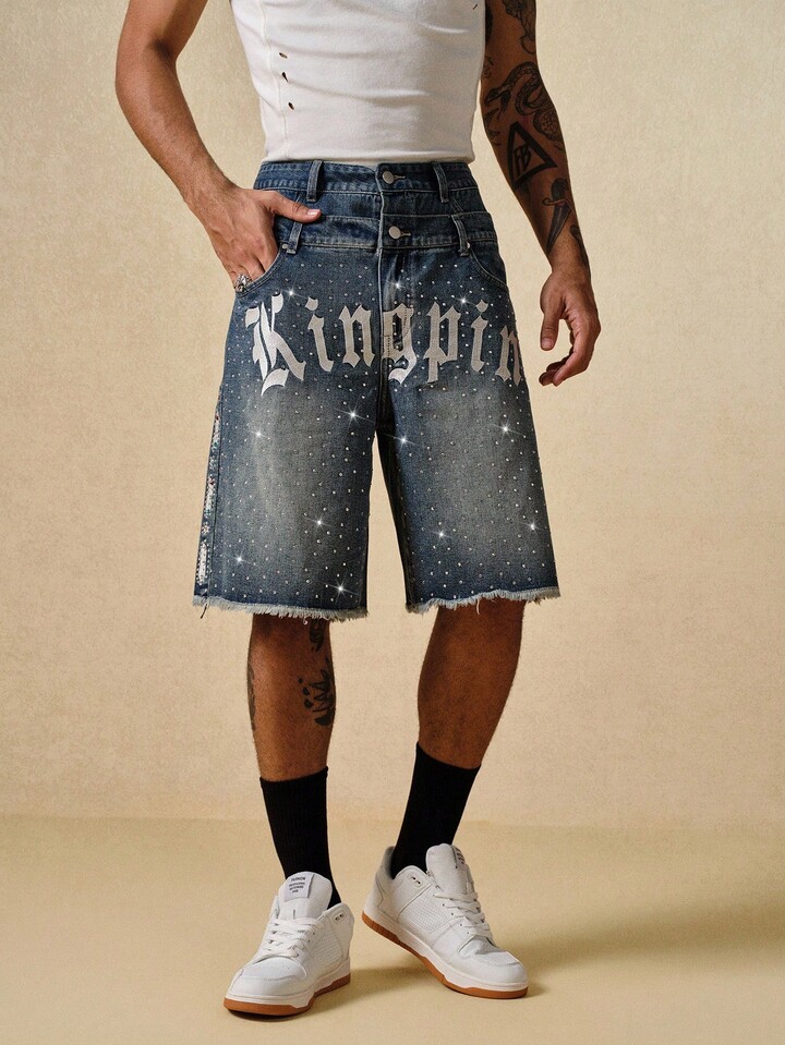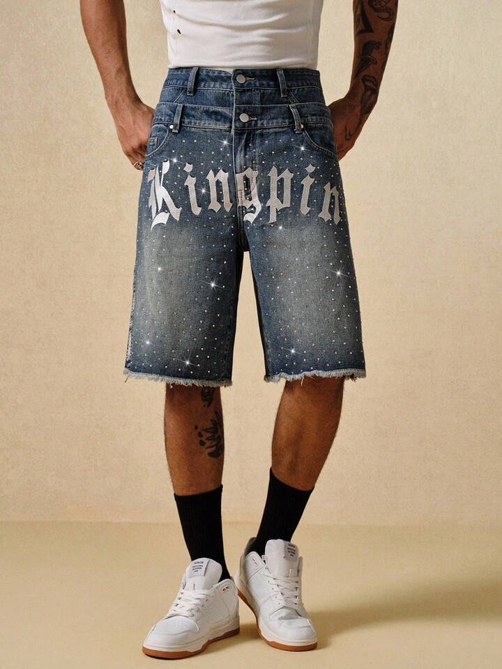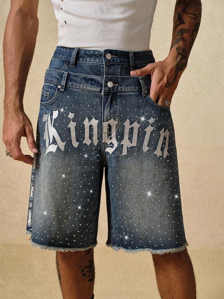 Street Life Men's Double-Layer Waist Sparkling Diamond Letter Embroidery Loose Denim Shorts