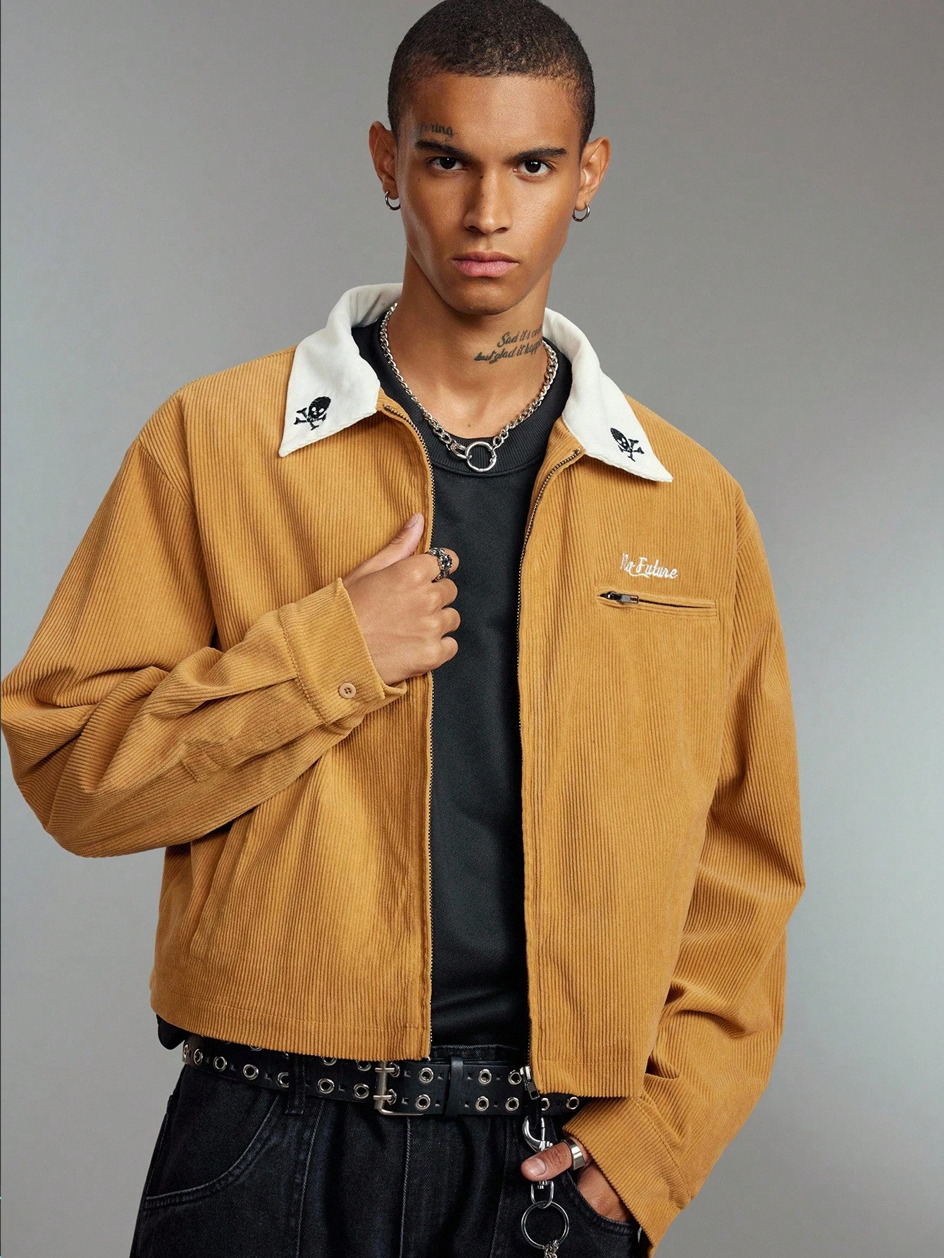 Street Life Men's Fashionable Casual Zip-Up Skull Corduroy Jacket, For Fall