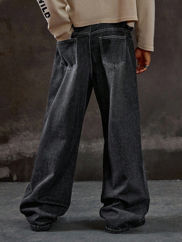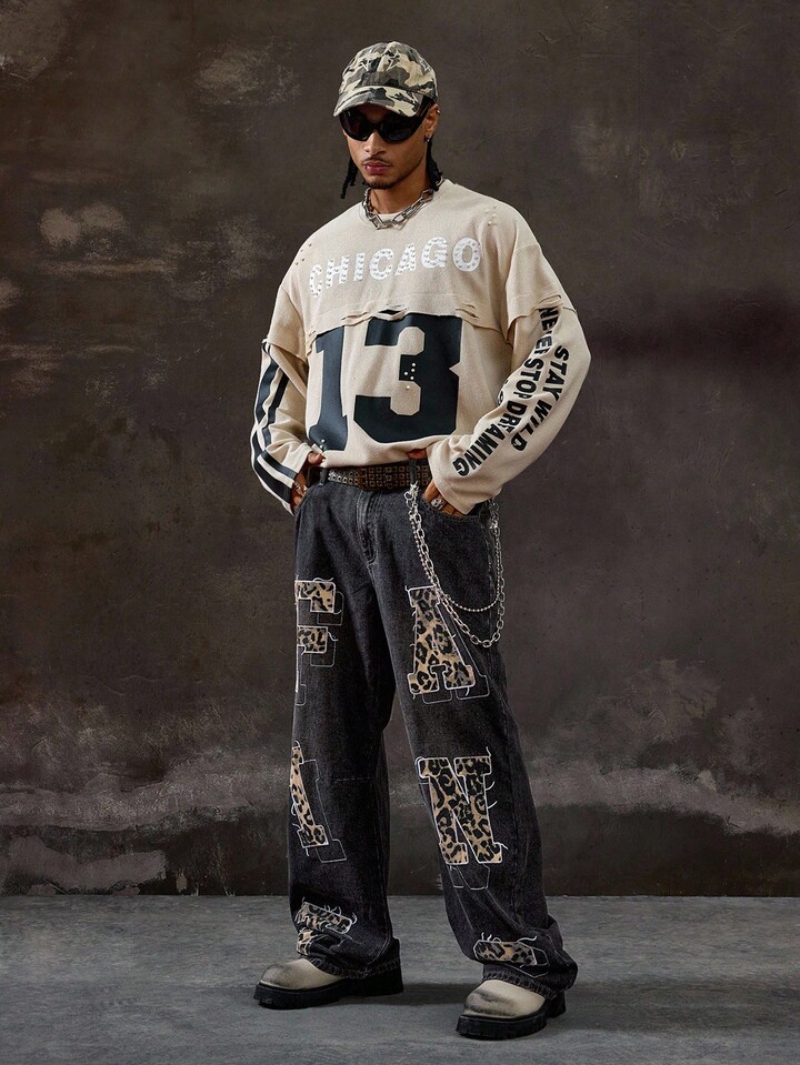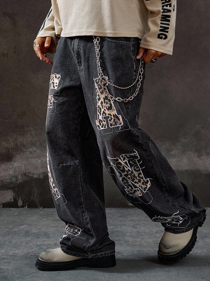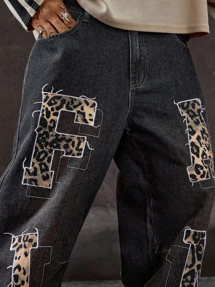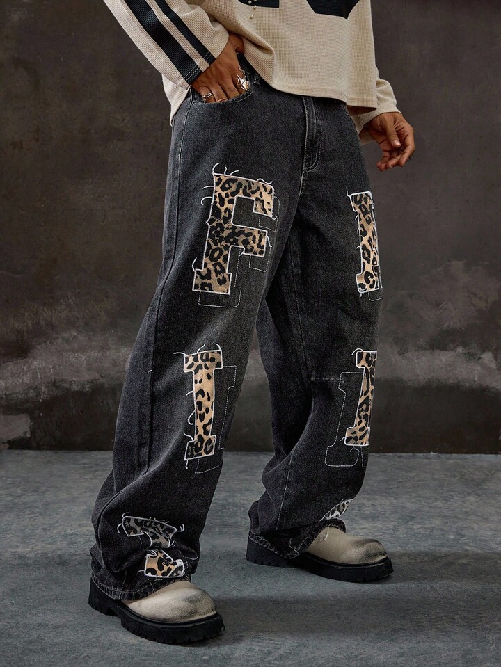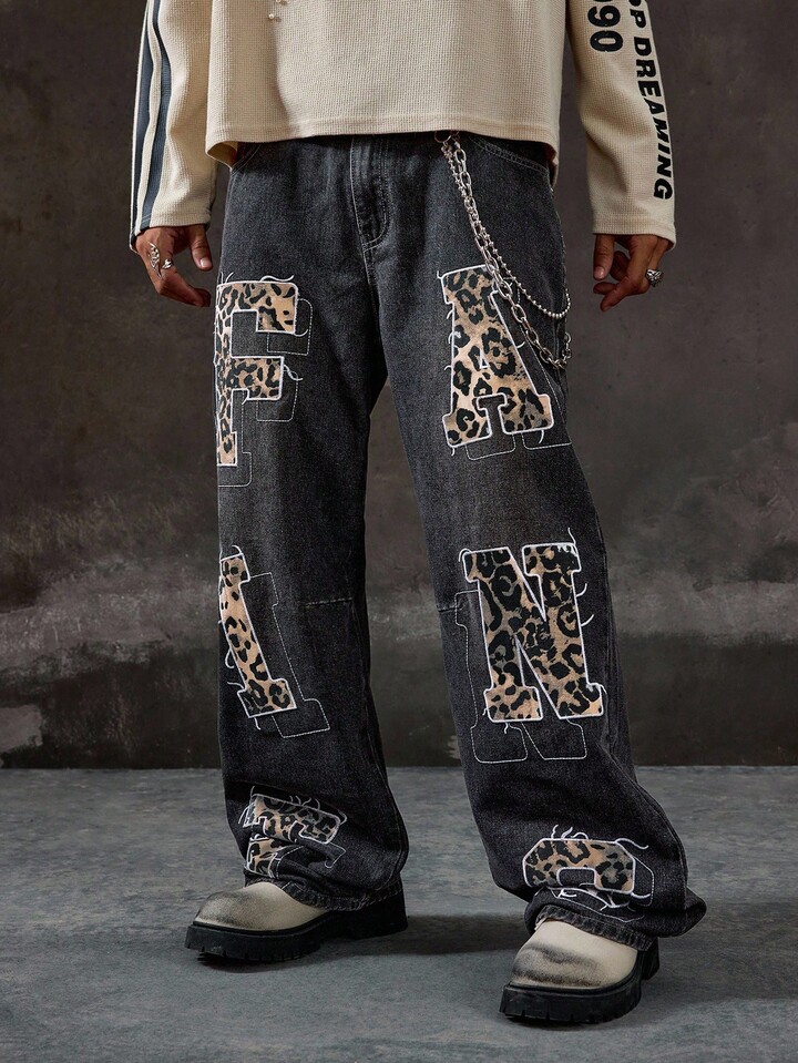 Street Life Men's Fashionable Leopard Letter Print Patch Denim Jeans