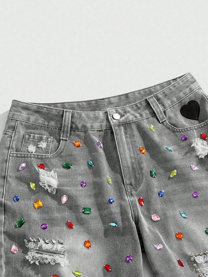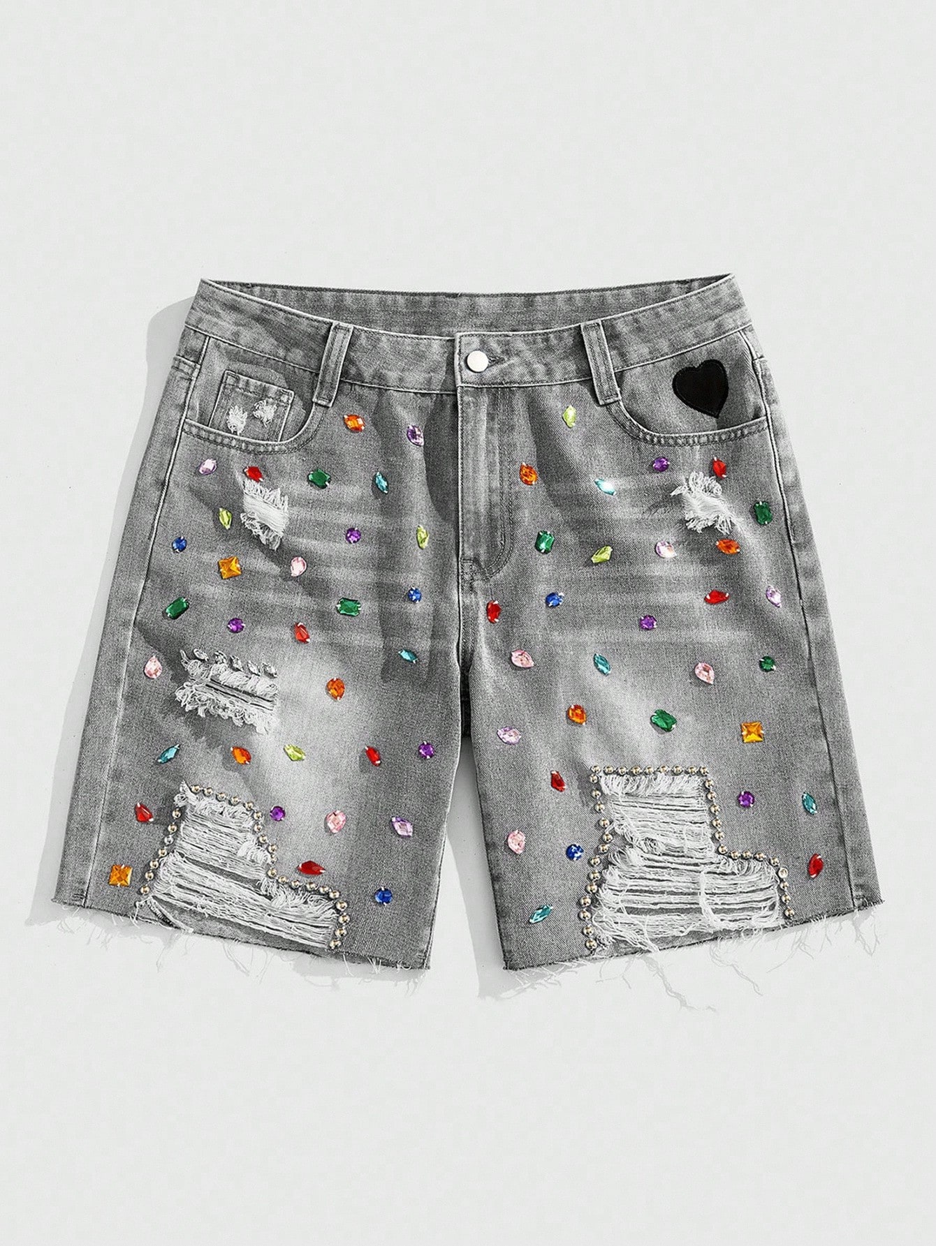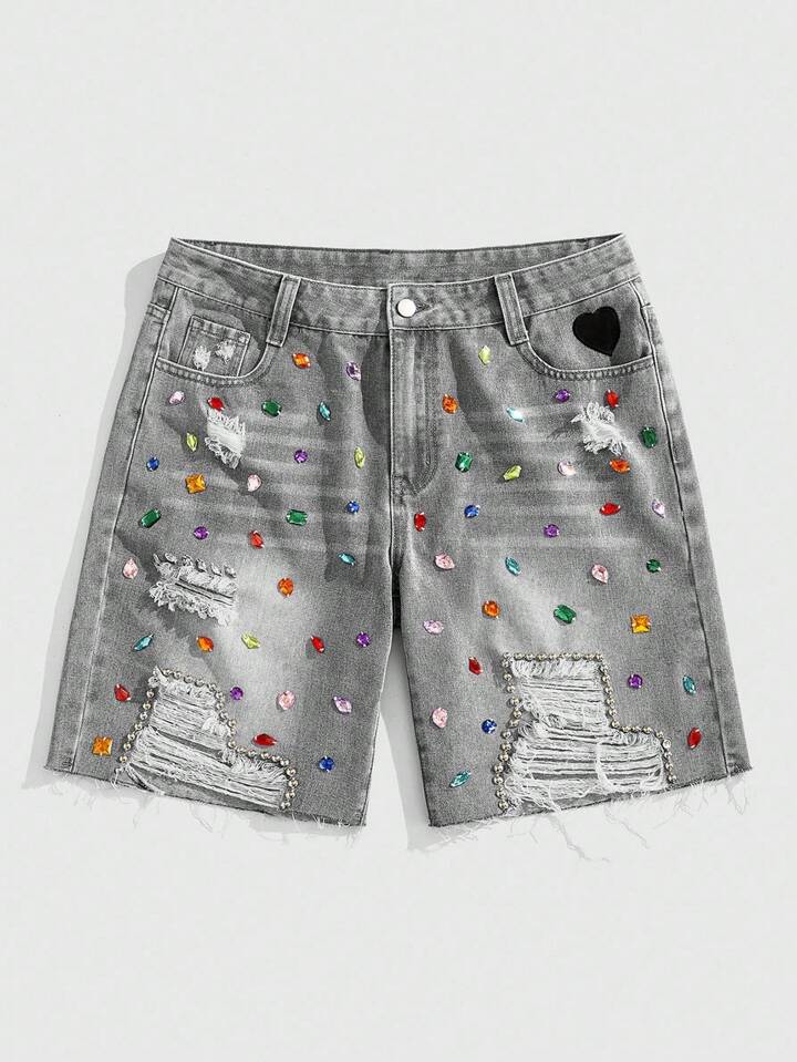 Street Life Men's Fashionable Ripped Rhinestone Denim Shorts, Summer